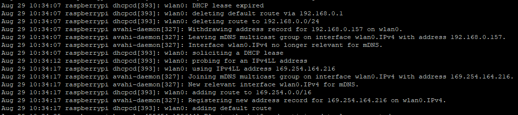 Ganz oben: DHCP lease expired. Die IP-Adresse, die das WLAN des Raspis vom DHCP-Server bekommen hat, ist offenbar nur für einen Tag gültig (das ist eine Einstellung des DHCP-Servers). Danach versucht der Raspi eine neue IP-Adresse zu bekommen, bekommt aber keine. Eigentlich sollte ihm der DHCP-Server die gleiche geben, die er bis dahin hatte (192.168.0.157). Da er offenbar keine bekommt, weist er sich eine eigene Adresse zu: 169.254.164.216. Diese Adresse ist aus deinem Netz nicht zu erreichen.