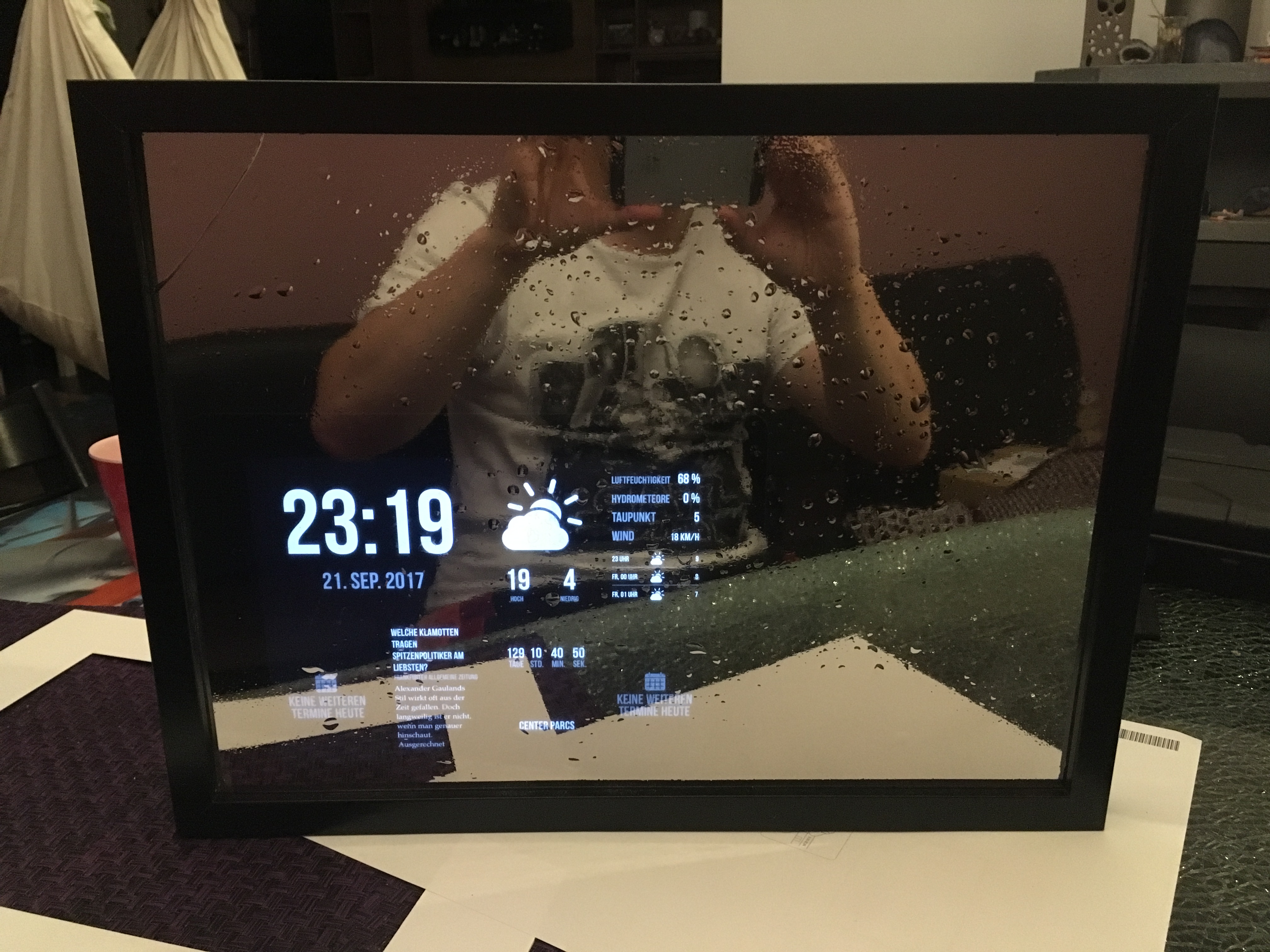 Nachdem ich die letzten Tage ein paar Bestellungen getätigt habe ubd heute noch zuletzt der Bilderrahmen gekommen ist, hat es mich noch gepackt, zumindest auf die Schnelle zu kucken, ob es prinzipiell was werden kann mit meinem "Smart Mirror - low budget". Da ich erst einmal vor hatte, einen Proto-Typ zu bauen, habe ich nicht unbedingt auf gute qualitative Verarbeitung geschaut. Ich habe für den Prototyp auch erst einmal Spionspiegelfolie verwendet, die im Vergleich zum Spionglas zwar wesentlich günstiger ist, aber natürlich lange nicht dasselbe Ergebnis liefert. Doch nun seht selbst, was nach nur 10 min. entstanden ist: