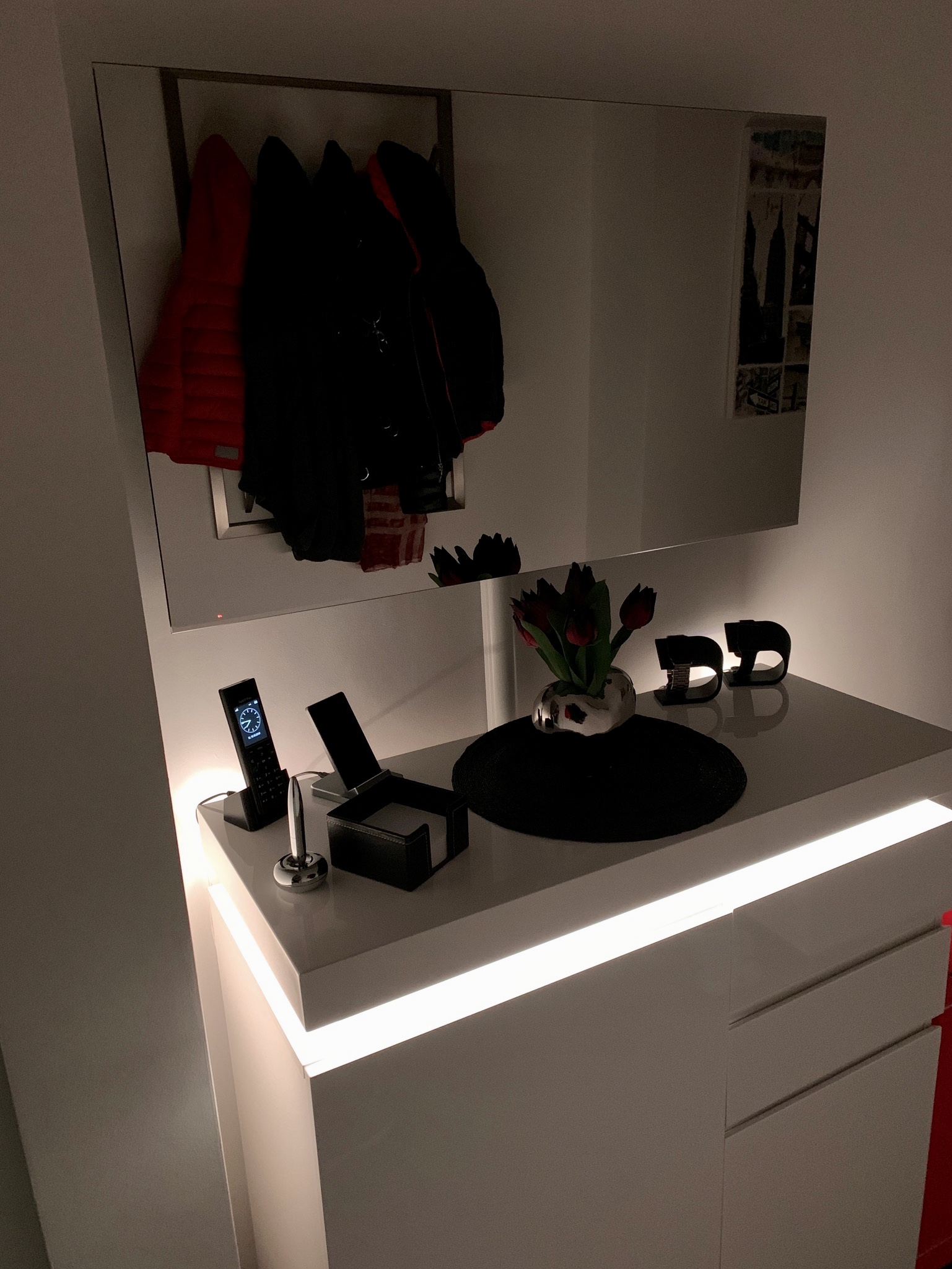 Angesteuert wird der Spass in HomeKit durch einen Harmony Hub und eingeschaltet bzw. ausgeschaltet wird der Spiegel durch einen Hue Bewegungsmelder bei Bewegung.