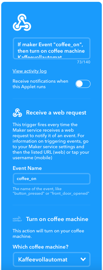 Das erstellt einen Schalter on/off für die Kaffeemaschine und senden einen trigger an IFTTT Webhooks.Und entsprechend on oder off, wird dann der verbundene Home Connect Coffee Machine an oder aus geschaltet.