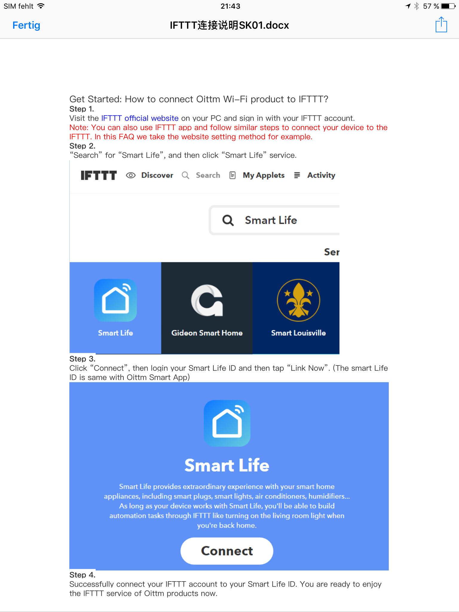 Das habe ich vom Hersteller erhalten.Was soll ich sagen, Diffuser ist da. Ich habe jetzt on/off in Ifttt angelegt aber es passiert nichts. Kann ich mit Check die Regel testen bzw wird sie dann geschaltet? Habe den Diffuser auch in HomeKit eingebunden aber da passiert auch nichts?