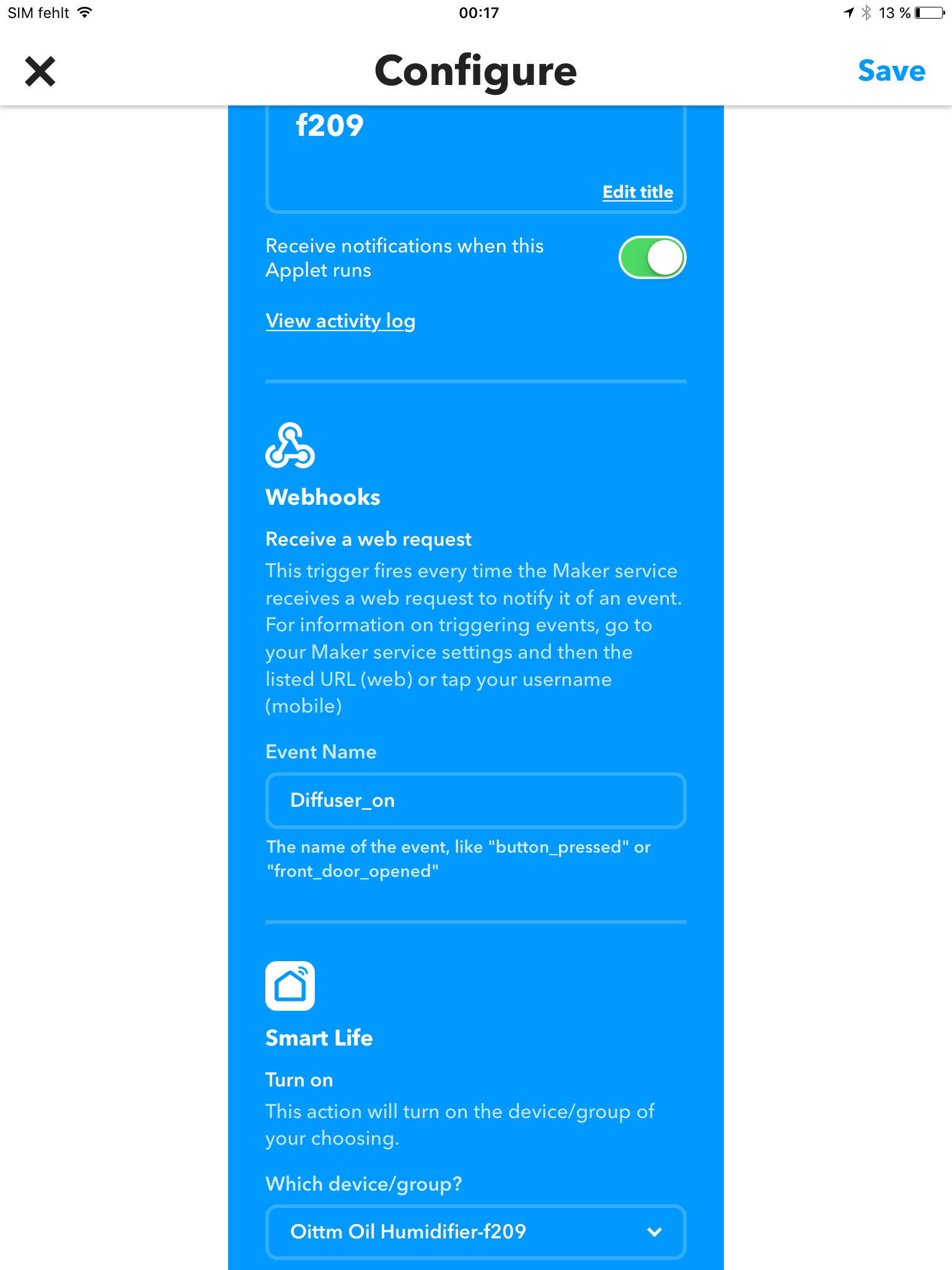 Wie gesagt, Du musst schauen was der IFTTT Bereich von Deinem Diffusor-Hersteller hergibt.