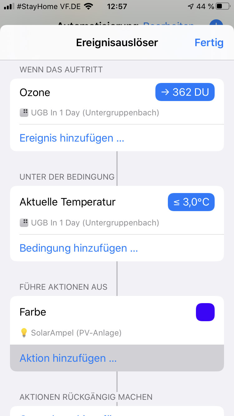 • Für dieses Problem ist es sinnvoll, zunächst eine Automation in der Home zu erstellen und diese dann in Home+ weiter zu bearbeiten.....