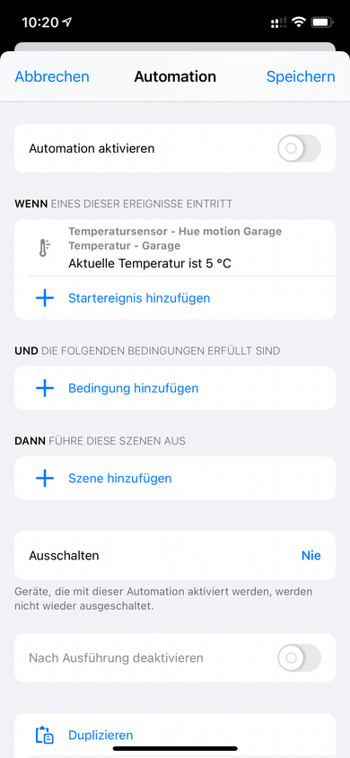 Ich bin hier nach vorgegangen. Aber man kann, wenn man in Home auf den Hue Bewegungsmelder (mit Temperatur) geht, ja keine Automationen erstellen. Er wird nur angezeigt.
