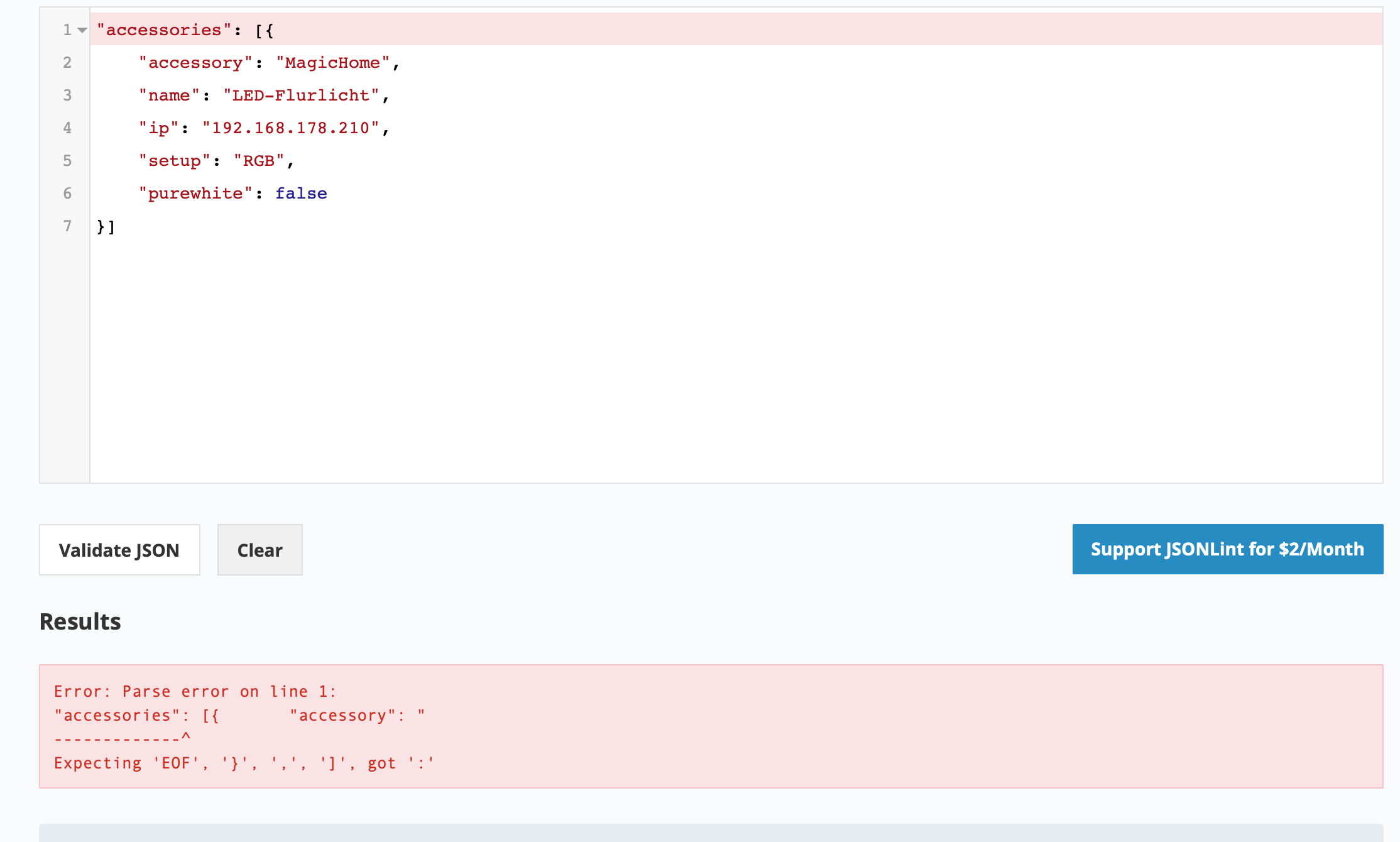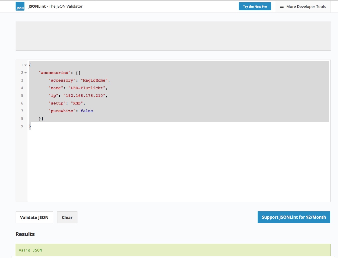 • z-smoker so, ich habe mich mal dran gemacht und es versucht, ich habe den RGB Controller mittels der App in unser Netzwerk eingebunden, so dass er eine IP Adresse bekommen hat, die habe ich mir dann in de Fritz!Box rausgesucht und angepasst, alles mit HomeBridge ist ab 200, habe die dann in die Config wie auf der Webseite angegeben eingepflegt und auf JSONLint geprüft, ich glaube aber da fehlt noch was, denn der meckert, schau bitte mal selbst.