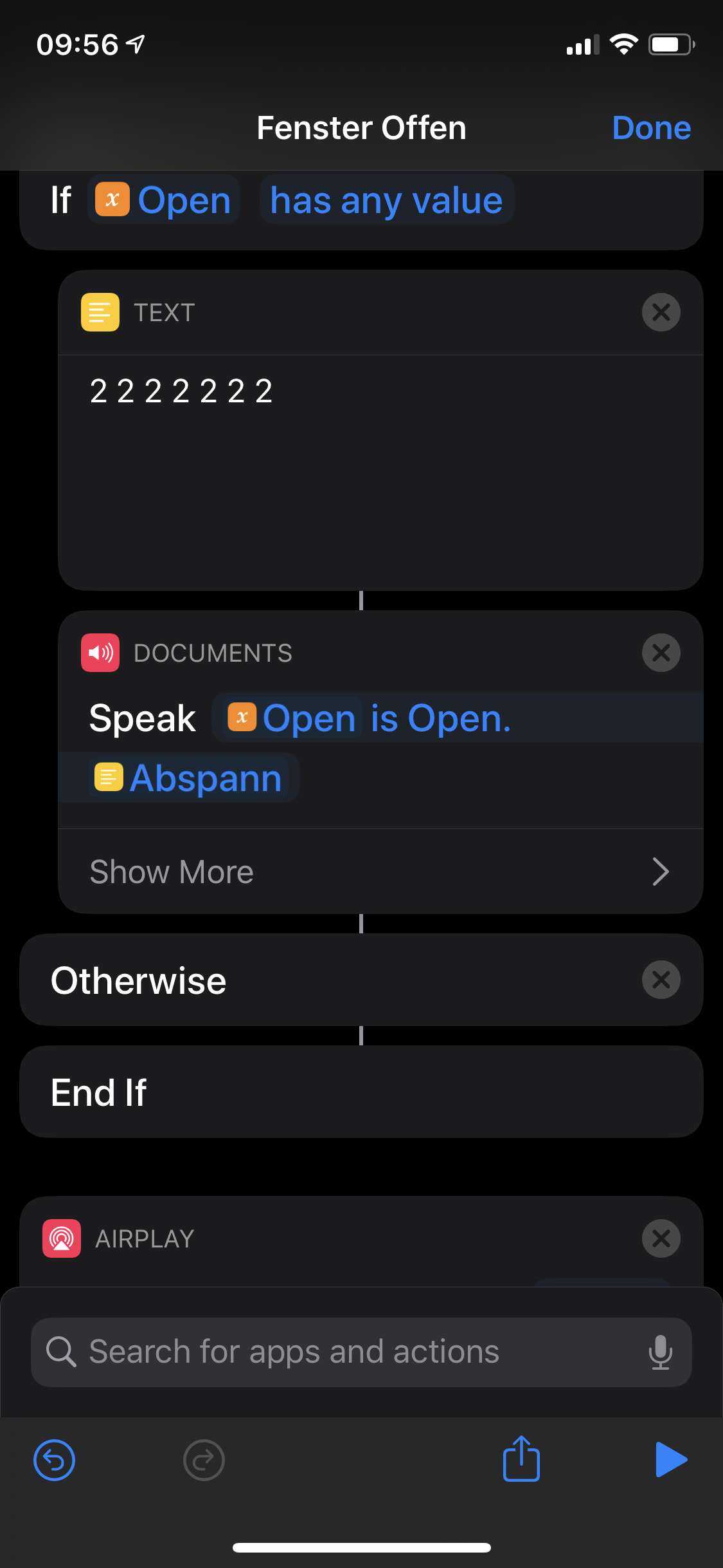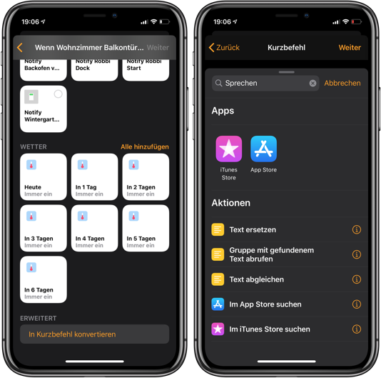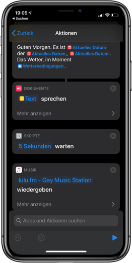 Wenn die Wiedergabe allerdings über AirPlay auf einem AppleTV stattfinden soll dann wird der gesprochene Text leider einfach abgeschnitten, falls danach noch Befehle kommen, oder zuvor schon Musik wiedergegeben wurde, welche ja nach dem Text weiterläuft. Bei der Aktion "Text sprechen" habe ich natürlich die Option "Warten, bis abgeschlossen" aktiviert.