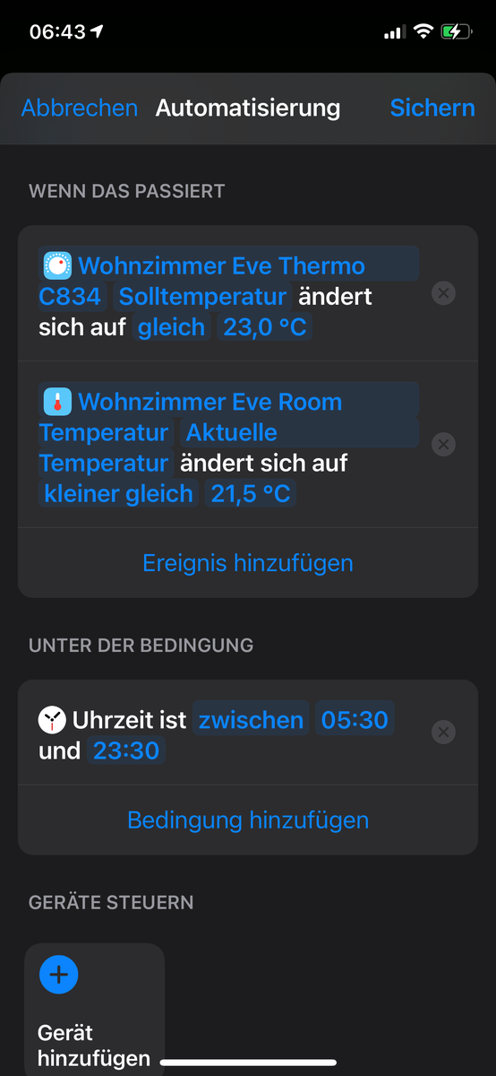 Die Automatisierung wurde erst um 06:20 Uhr durchgeführt, als ich in der Eve-App manuell die Room-Daten aktualisiert hatte.