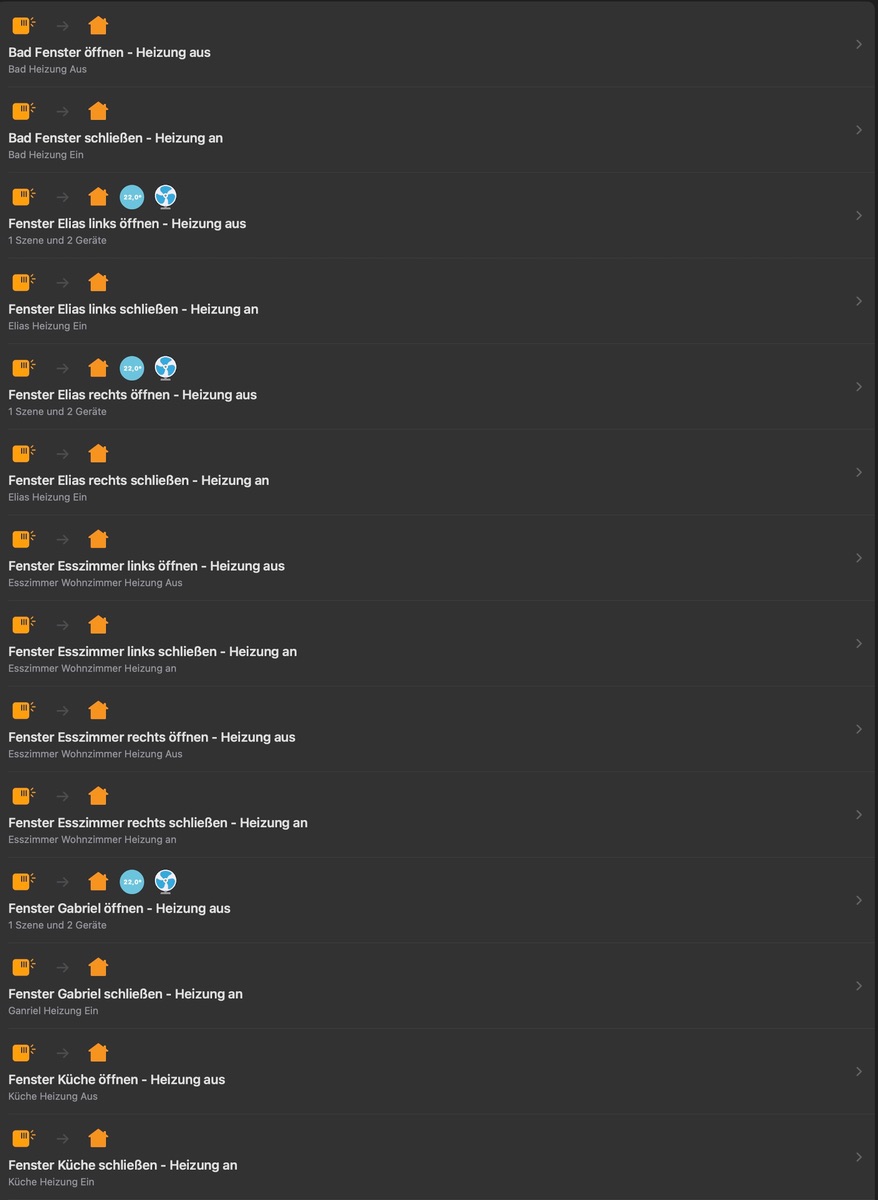 Im folgenden habe ich zum Heizen vier Szenen, sowie vier Regeln/Automatisierungen mit drei unterschiedlichen Auslöser-Kombinationen erstellt:
