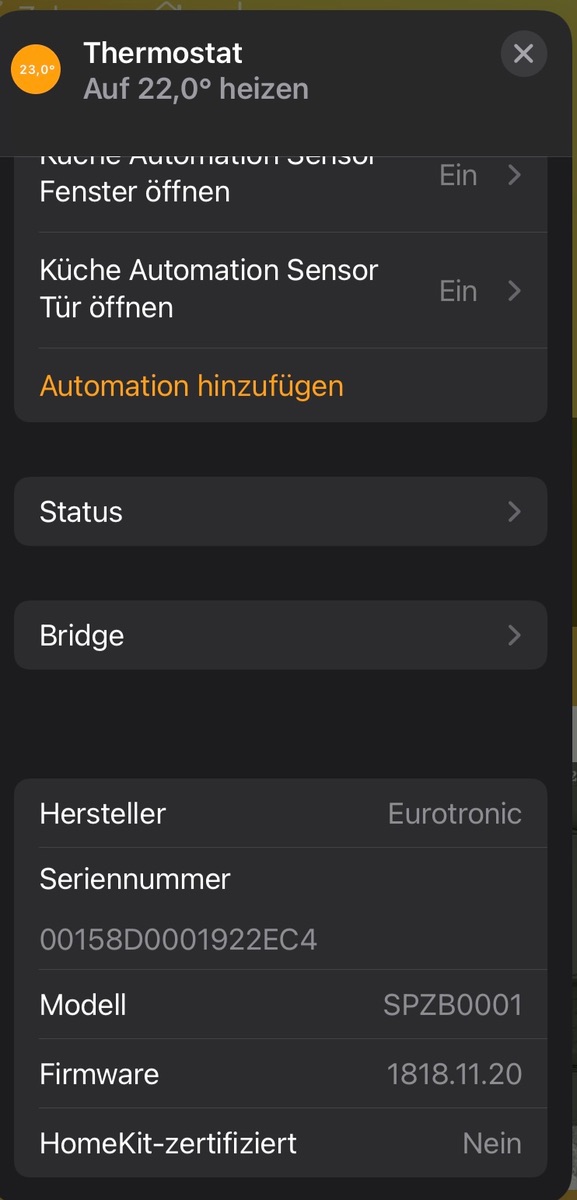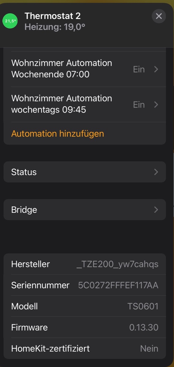 Danke für das schnelle Update. Dann haben sich meine Befürchtungen somit bestätigt und ich bleibe vorerst bei den Eve Thermos. Bin soweit zufrieden nur würde ich gerne heiztechnisch auch auf Zigbee setzen da Bluetooth in Homekit mist ist mMn. und auch sonst alles andere bei mir bereits über deconz im Zigbee Mash tadellos funktioniert.