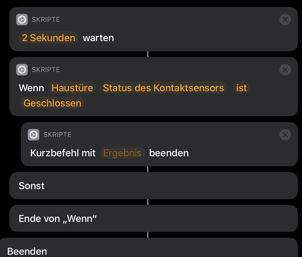 Ich habe mir nun eine Kurzbefehle-Automation gebaut die erkennt wenn die Tür geöffnet und nach einem Zeitraum X nicht wieder geschlossen wurde und ab dann im Zwei-Sekundentakt eine HUE Lampe rot blinken lässt. Leider habe ich (noch) keinen Kontaktsensor an der Badezimmertüre aber mit der Haustüre funktioniert es auch... (Also nicht wundern wenn die Bezeichnungen in meinen Screenshots keinen Sinn ergeben). Auslöser ist logischerweise ebenfalls der Türsensor selber.