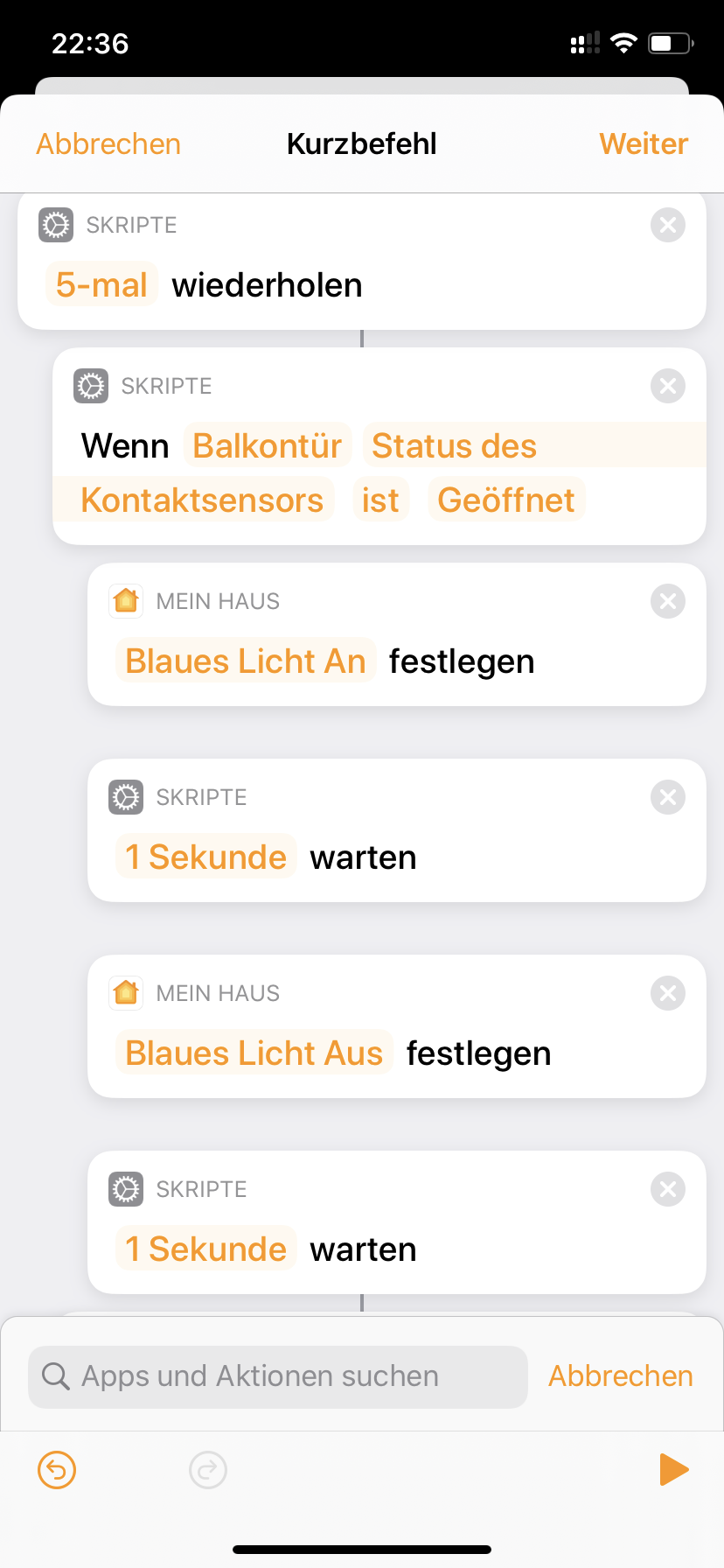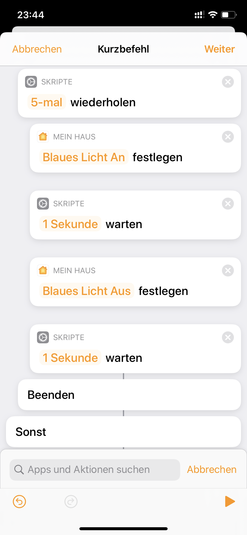 Nach der Sekunde müssen wir das Licht wieder ausschalten. Als Aktion wählen wir also „Zuhause steuern“ und selektieren die HomeKit Szene, die unser Licht ausschaltet. Danach warten wir erneut eine Sekunde. Alle Aktionen befinden sich innerhalb des „Wiederholen“-Blocks.