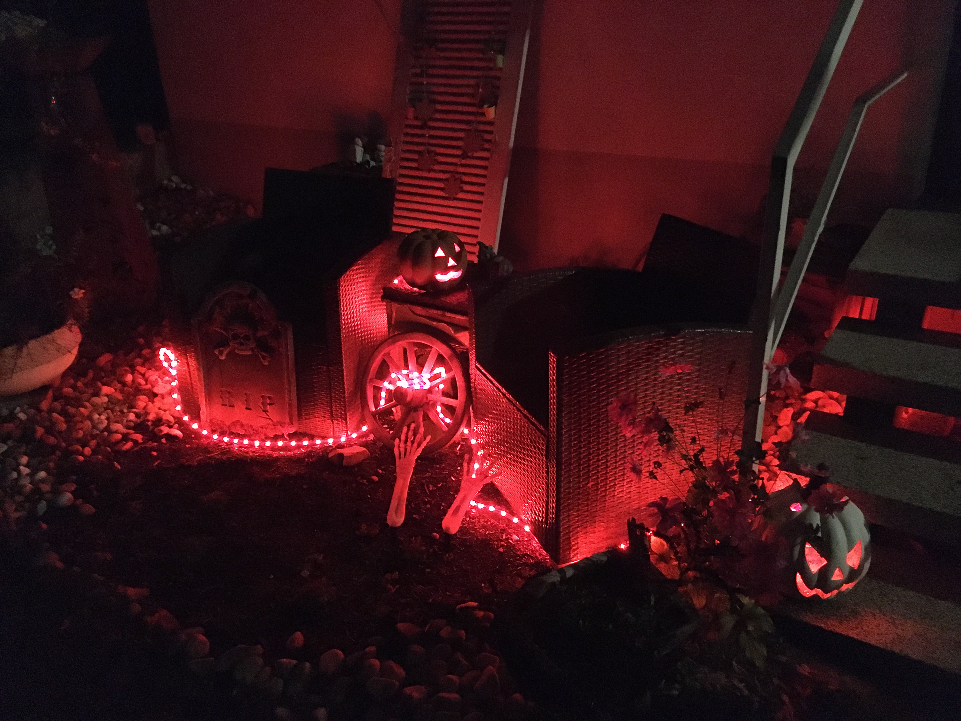 Ziel ist es bei Bewegung vor dem Eingangsbereich der Haustüre, dass sich nicht das reguläre Flutlicht der Netatmo Presence anschaltet, sondern erst einmal ein roter Lightstrip, der die Kürbisse, den Grabstein und die Skellett-Arme in Szene setzen soll.