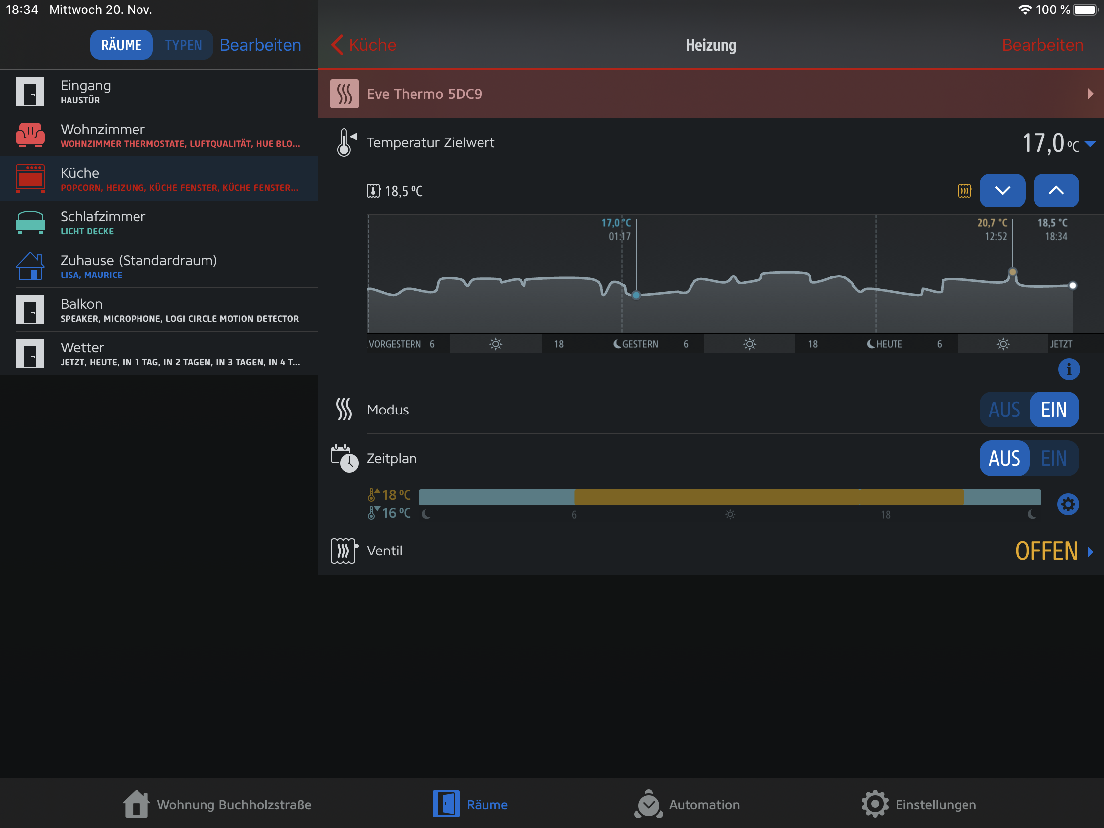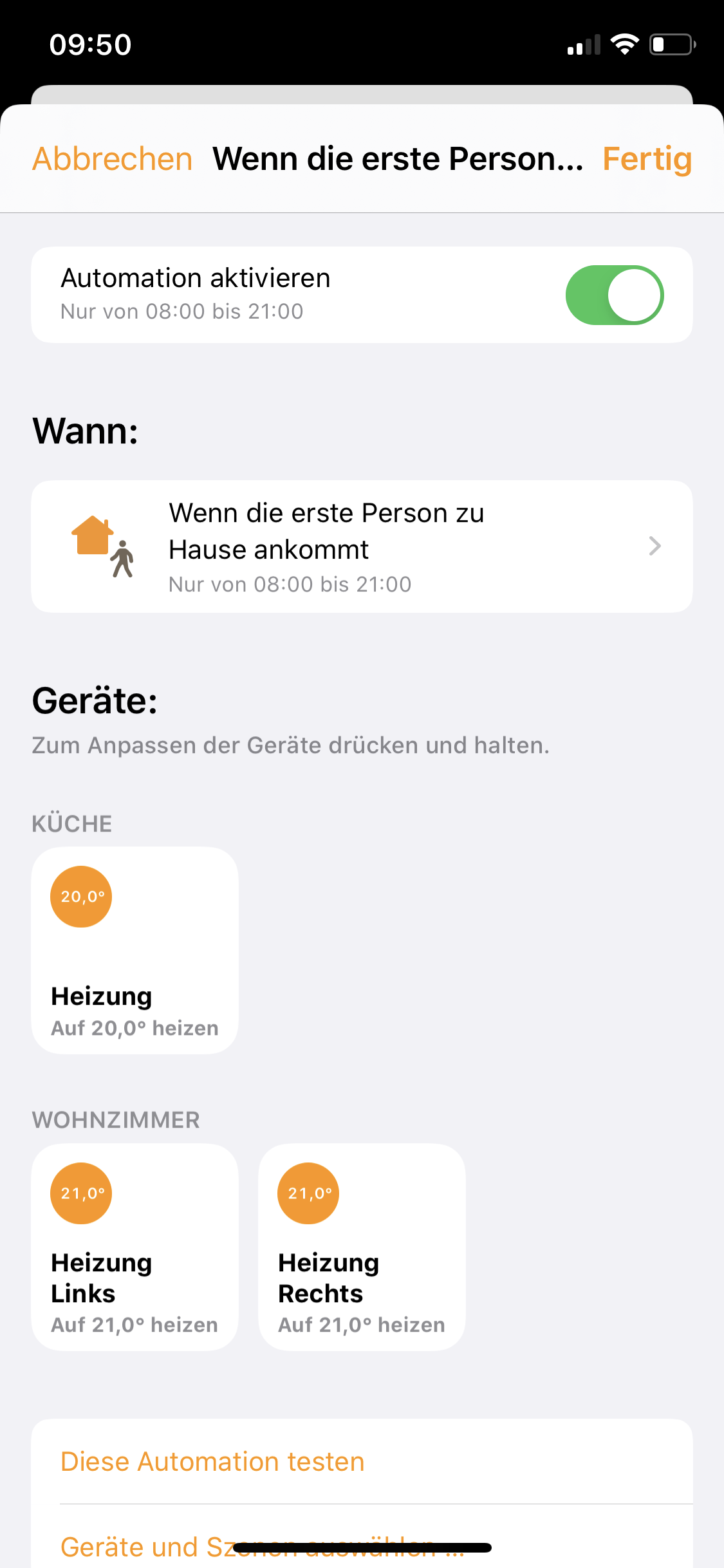 In der Homekit App hab ich folgendes Eingestell ( Siehe Bild im Anhang ) Sobald die erste Person zu Hause ankommt sollen die Heizung erhöht werden,Küche 20 Crad und Wohnzimmer 21 Crad .