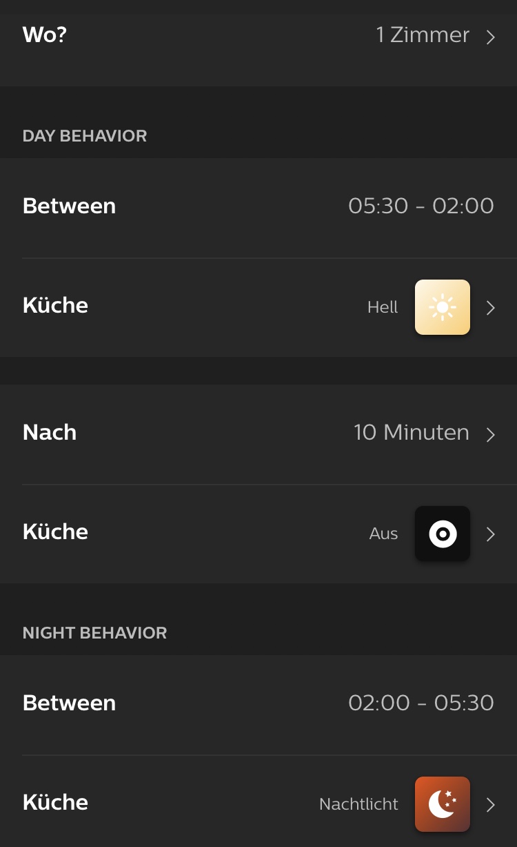- Langer Druck auf den Gruppenschalter (oder Lichtschalter im Widget) schaltet Farbtemperatur abhängig von Tag/Nacht