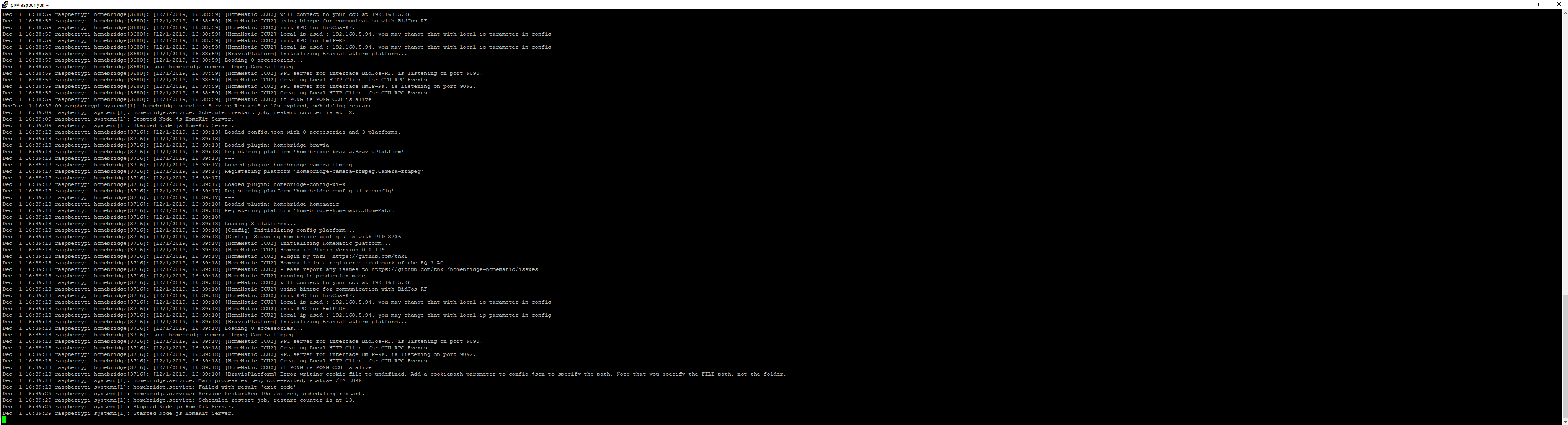 Dec 03 19:45:32 raspberrypi systemd[1]: homebridge.service: Scheduled restart job, restart counter is at 1.