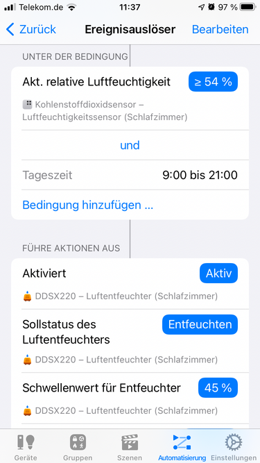 Die schönste Funktion des De’Longhi Luftentfeuchters ist wohl die HomeKit Integration. Damit könnt ihr das Gerät über Siri steuern, in HomeKit Szenen einbinden oder über HomeKit automatisieren.