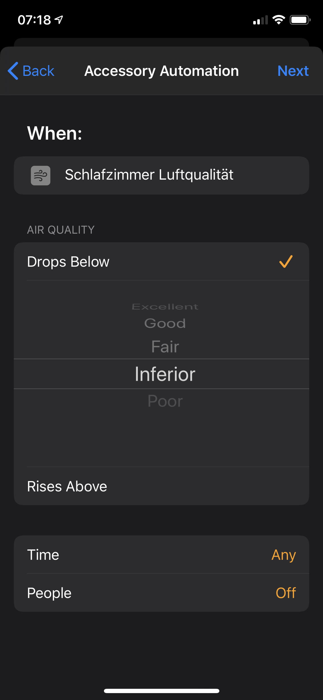 Das würde ich aber gerne automatisieren, aber leider bin ich nicht in der Lage, in Kurzbefehle den Status des Sensors irgendwie einzubinden. Es ist ja nicht „Detektiert oder nicht detektiert“, sondern ein Zustand „sehr gut“, „gut“ etc.