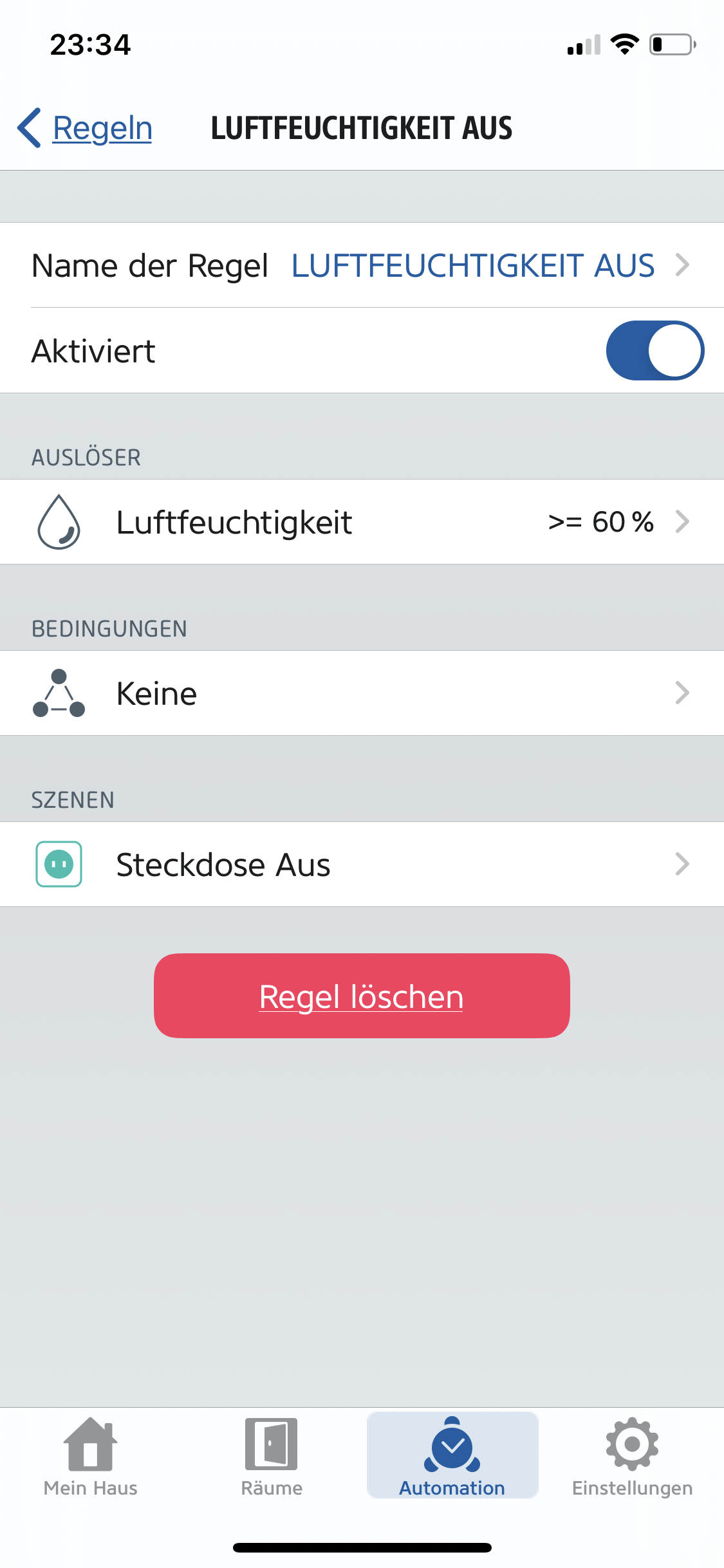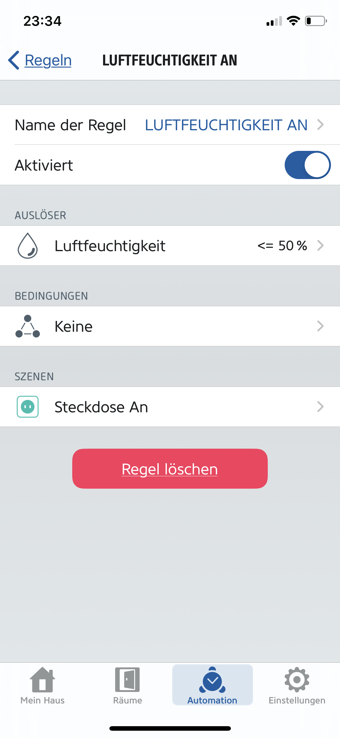 Gestern hab ich einen Aqara Sensor der Temperatur und Luftfeuchtigkeit misst eingebunden. Nun würde ich gerne eine Automation in homekit erstellen dass sich eine Wemo Steckdose (die auch in HB eingebunden ist) einschaltet wenn die Luftfeuchtigkeit unter einem Wert liegt.