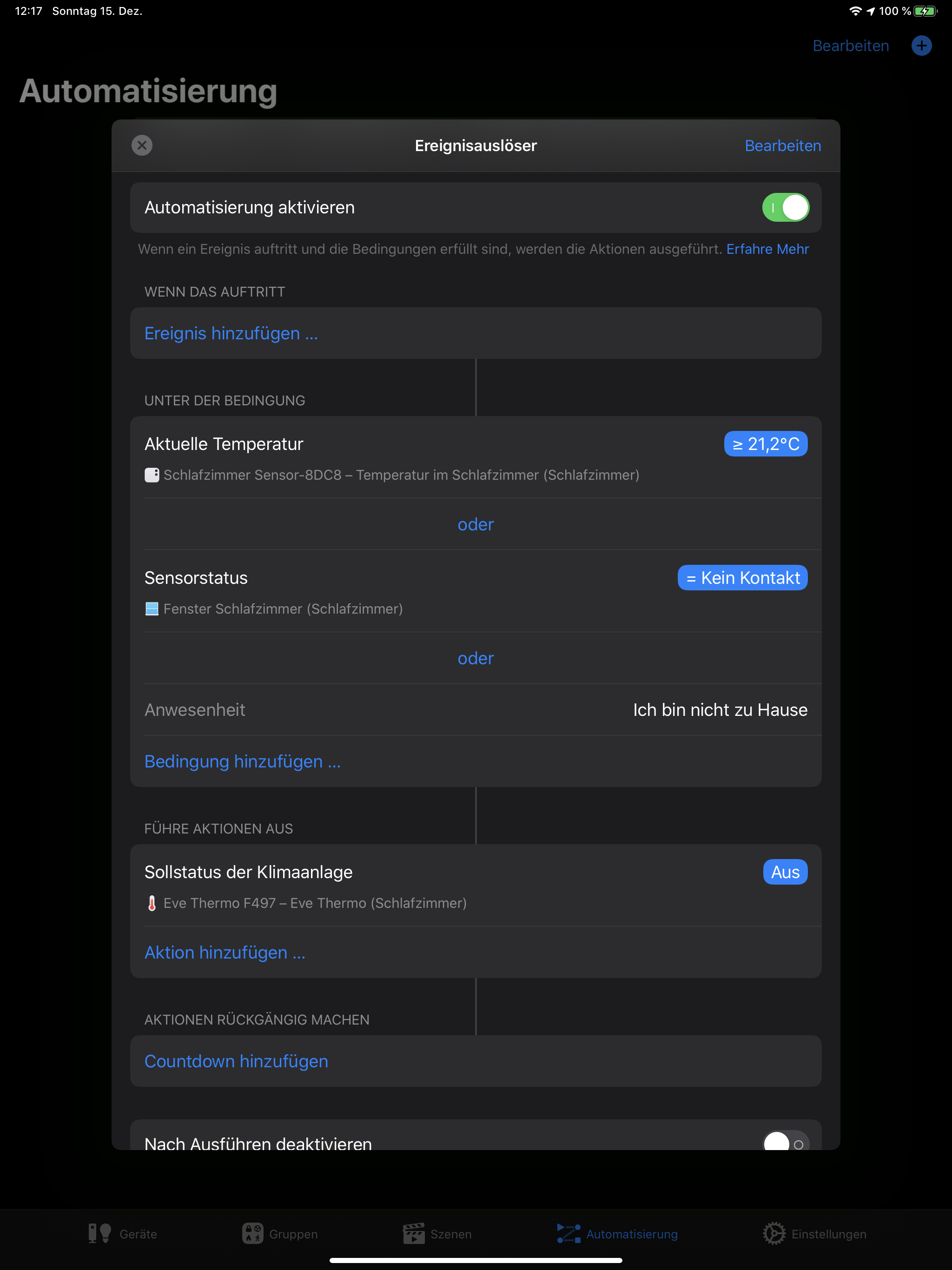 Heizung an im Urlaub > Ich bin zuhause und Fenster zu und unter 21 ºC und Montag bis Sonntag 09:30-23:30Uhr