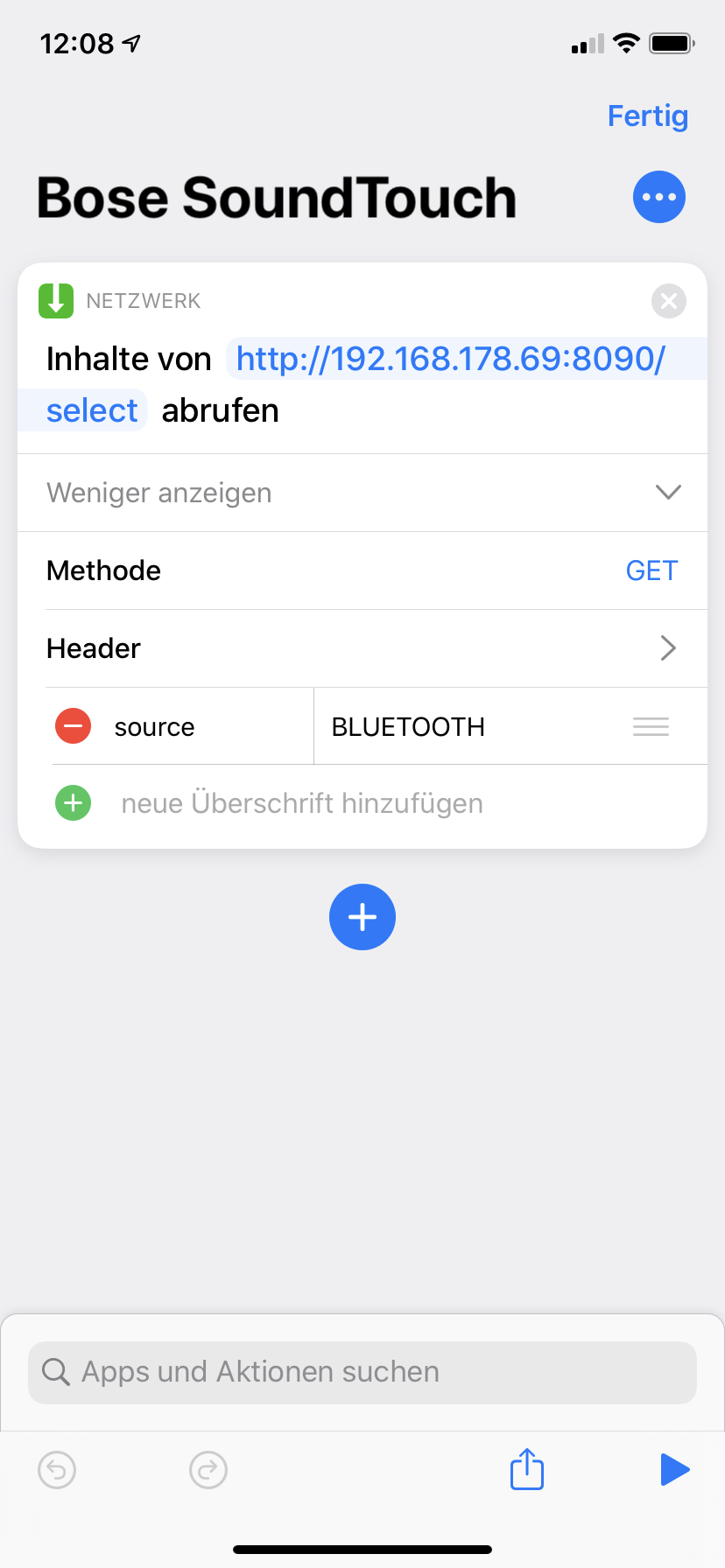 Wenn ich den Kurzbefehl aufrufe, soll auf dem Iphone Bluetooth aktiviert werden, sich mit dem Bose Lautsprecher verbinden und Deezer abspielen.