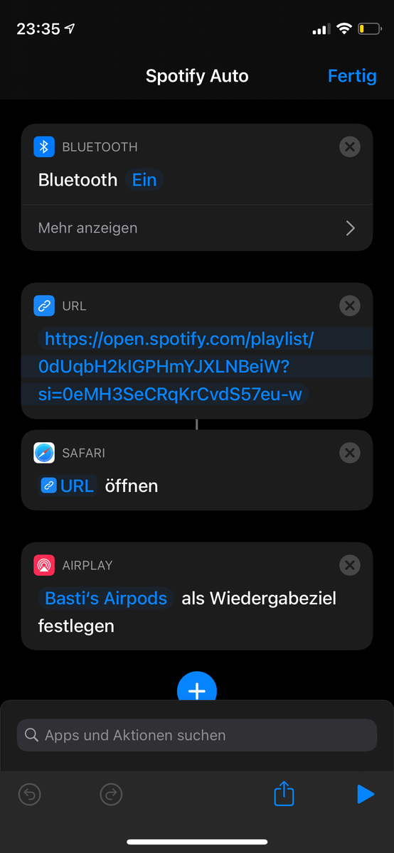 Punkt 1 und Punkt 3 klappt soweit. Der harken: üblicherweise ist der Bose Lautsprecher ausgeschalten bzw. geht nach einer gewissen Zeit aus. Wenn ich Bluetooth auf dem Iphone aktiviere und den Lautsprecher aus der Liste auswählen, schaltet er alleine ein und verbindet sich. Ich hatte gehofft das auch in die Automation zu übernehmen, doch dafür bräuchte ich irgendwie Zugriff auf die Bluetooth-Liste und konnte bisher noch keinen Kurzbefehl dazu finden. Hat jemand eine Idee?