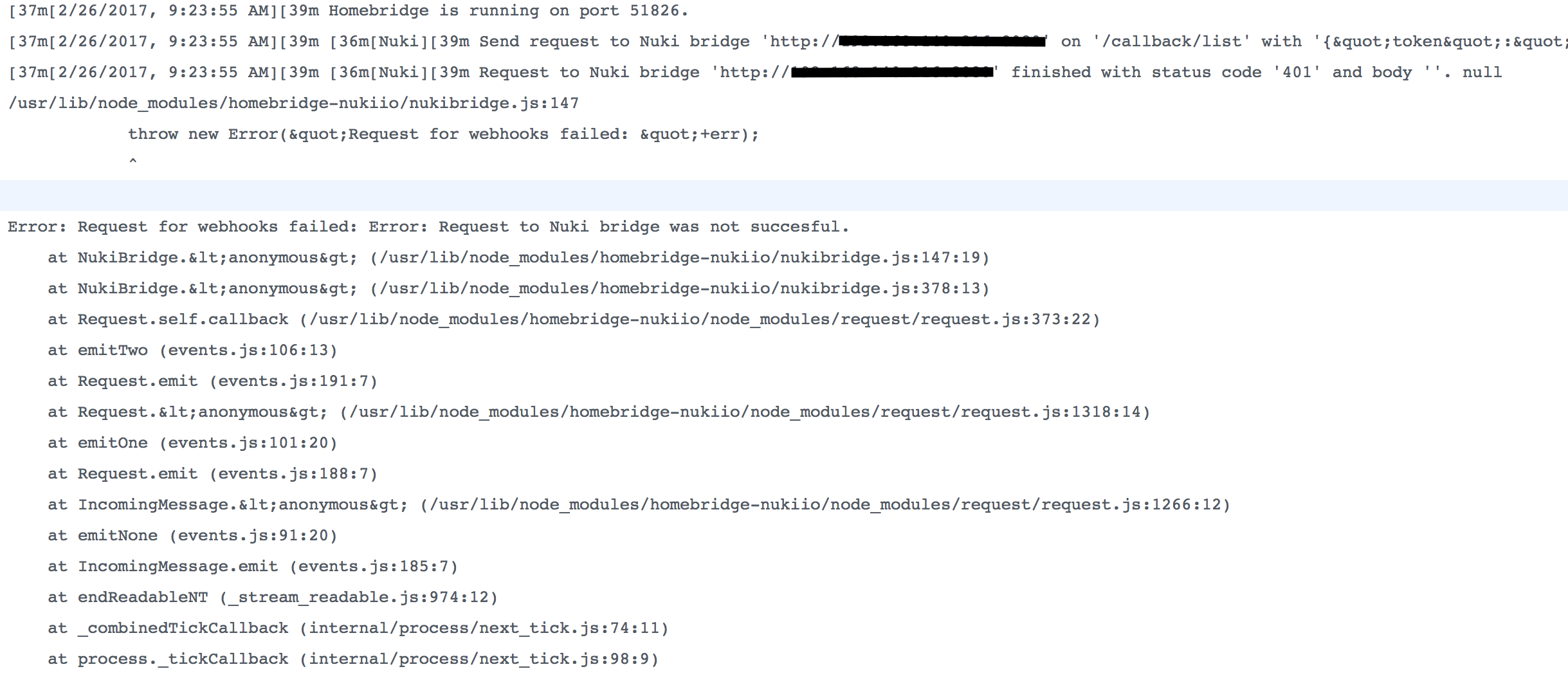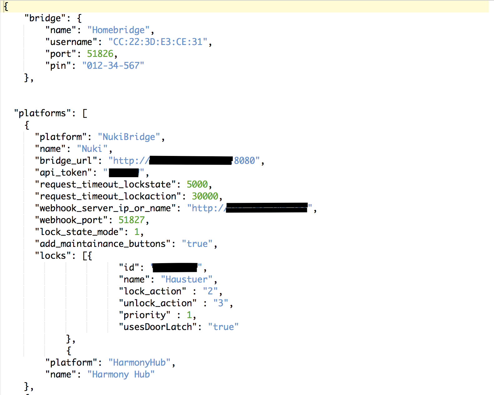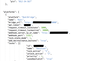 Alles anzeigen{ "platform": "NukiBridge", "name": "Nuki", "api_token": "xxxxxx", "bridge_url": "xxx.xxx.xxx.xxx:8080", "webhook_port": "51827", "webhook_server_ip_or_name": "xxx.xxx.xxx.xx", "lock_state_mode": "1", "add_maintainance_buttons": "false", "locks": [{ "id": "xxxxxx", "name": "Zuhause", "usesDoorLatch": "true"Das sieht doch aus , das die Webseite einen Fehler zurück gibt.