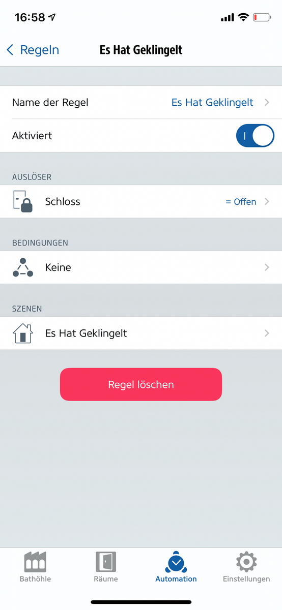 • Du kannst in einer Automation drauf reagieren, zB Licht an machen. Dieser aktiviert sich, wenn es klingelt.