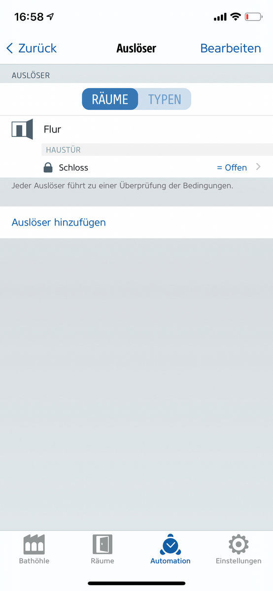 Die Automation löst aus , wenn ich das Türschloss der Haustür manuell über HomeKit oder in der Homebridge öffne, dann geht das Licht so wie geplant an.