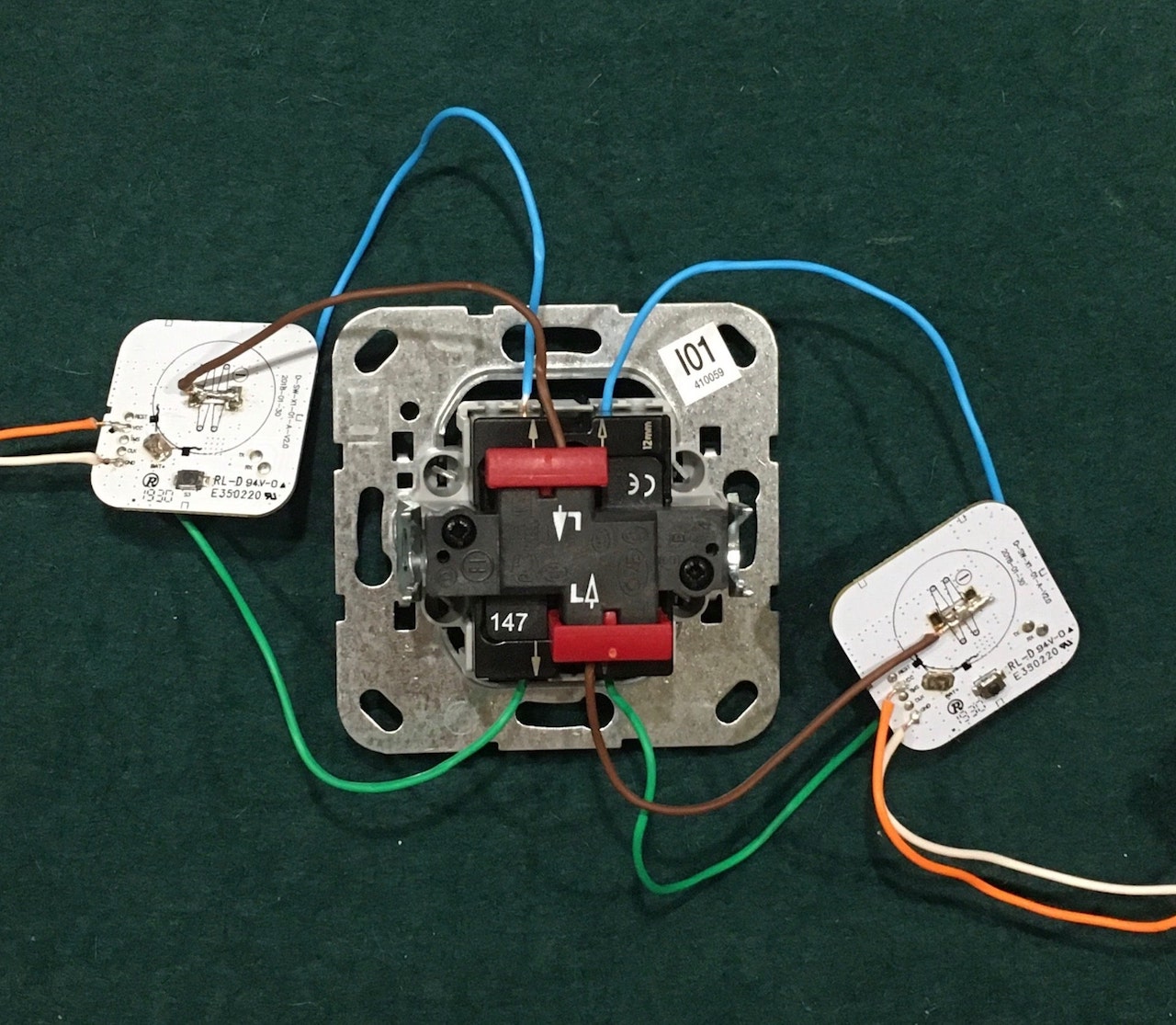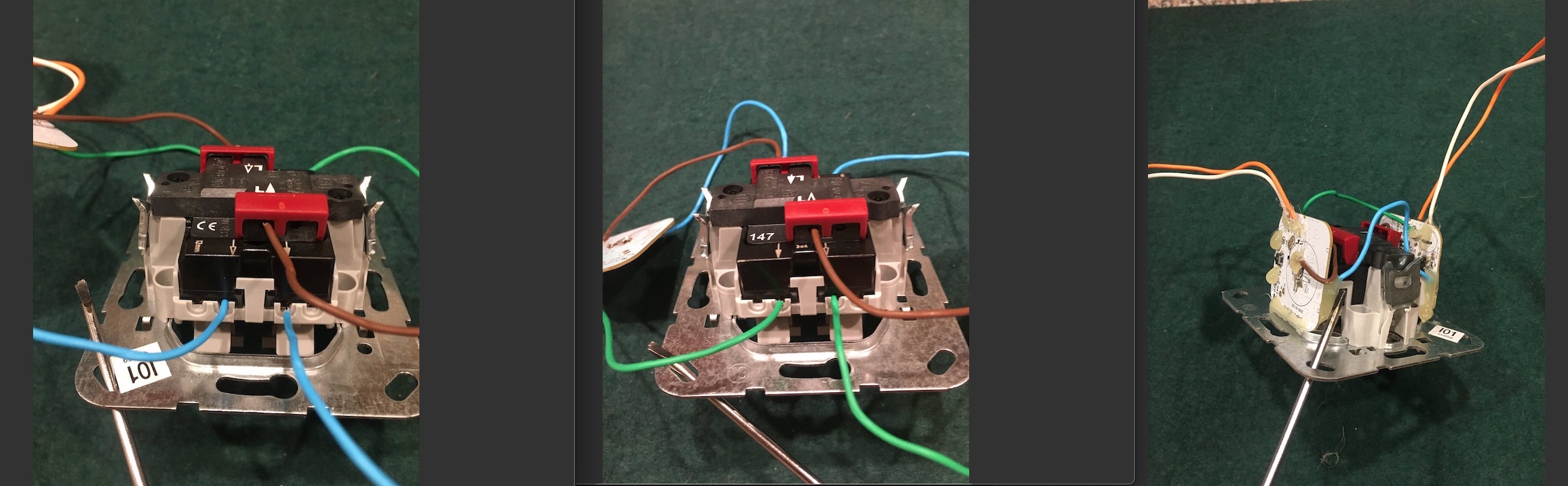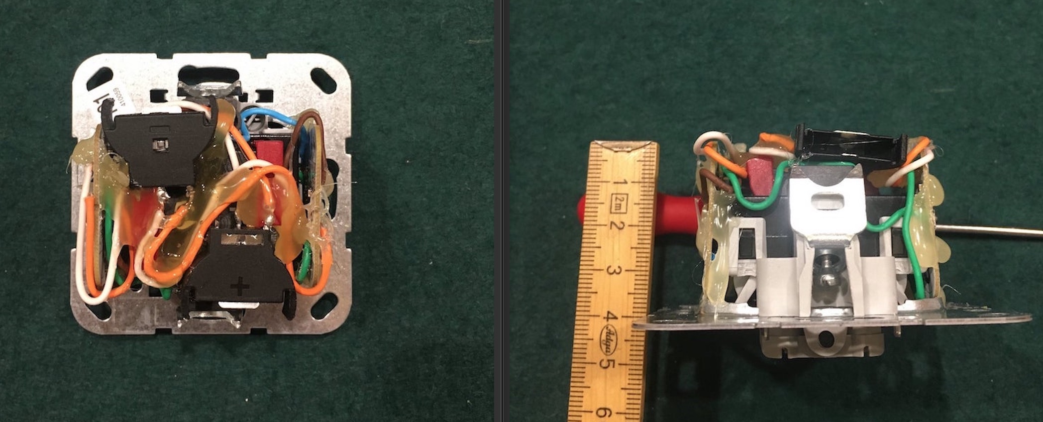 Mir ist noch nicht ganz klar an welche Pins des ehemals auf dem Dimmer befindlichen Tasters du das blaue und grüne Kabel jeweils gelötet hast - davon ist leider nichts auf den Bildern zu erkennen.