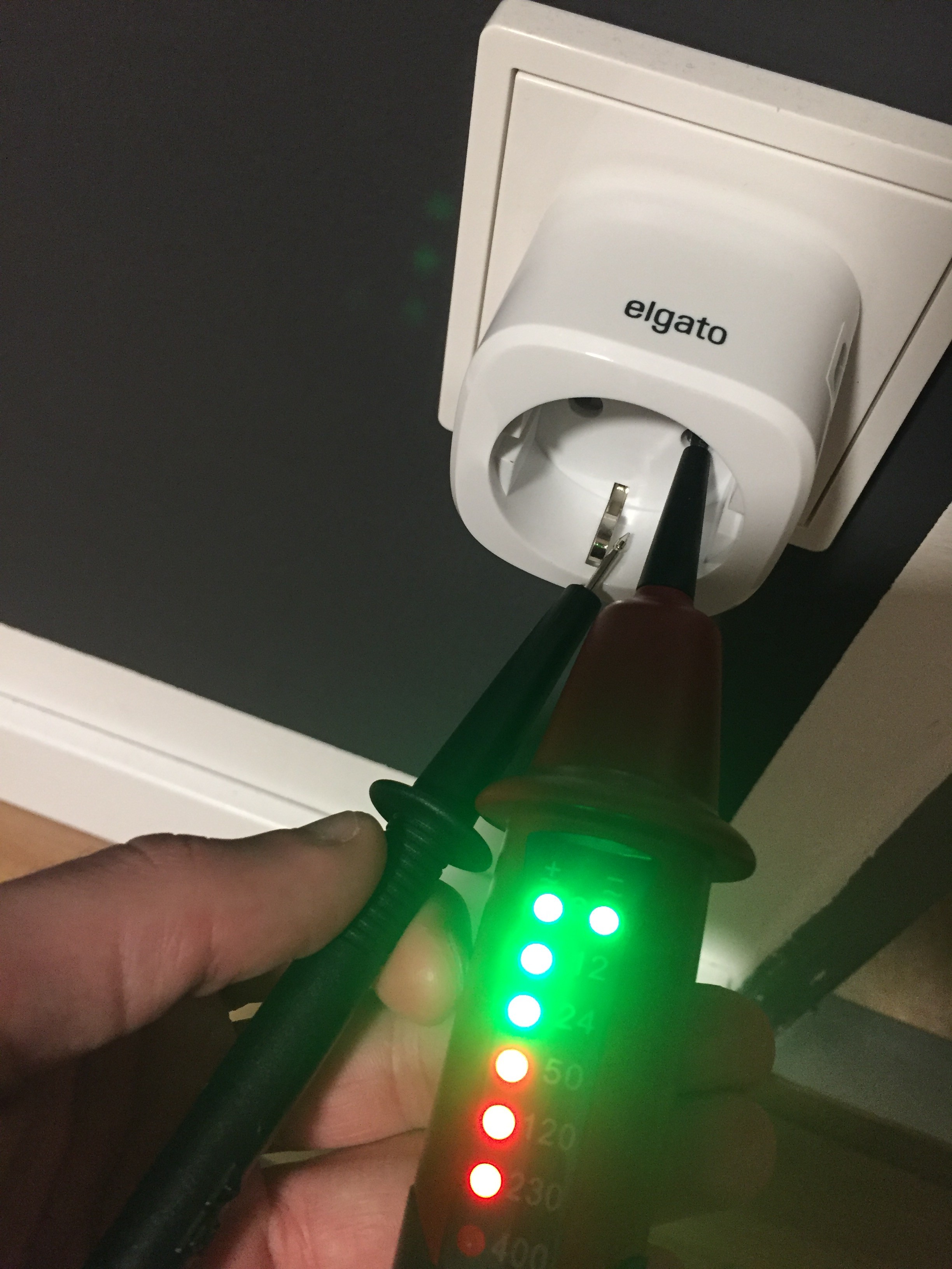Ob sich jetzt jeder einen Spannungsprüfer zulegt (einpolige Spannungsprüfer aka. Schraubendreher können das hier nicht messen!) bleibt natürlich jedem selbst überlassen. Für ein besseres Gewissen und Gefühl bin ich aber tatsächlich durch mein ganzes Haus gegangen und hab die Eve Energy entsprechend - wenn nötig - gedreht, damit der Außenleiter in jedem Fall geschaltet wird und die Geräte sicher spannungsfrei sind, wenn ich meine Eve Energy abschalte.