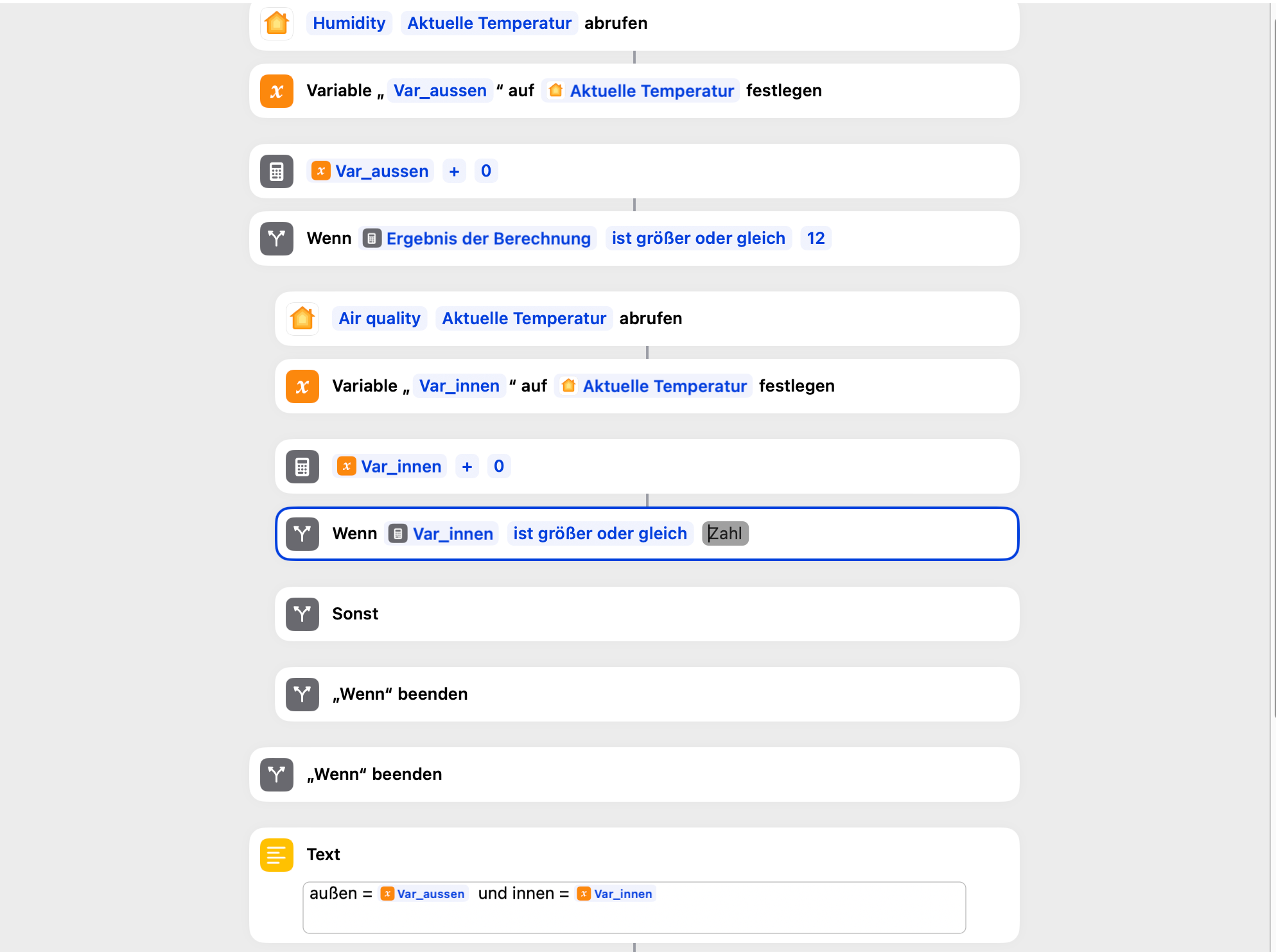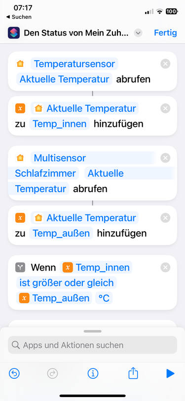 Falls ja, ist es möglich innerhalb eines Kurzbefehles den Farbwechsel von blau zu rot zu realisieren oder müsste ich hier 2 Kurzbefehle anlegen? Einen für den Fall, dass die Außentemperatur niedriger ist als drin und einen für das umgekehrte Ereignis?