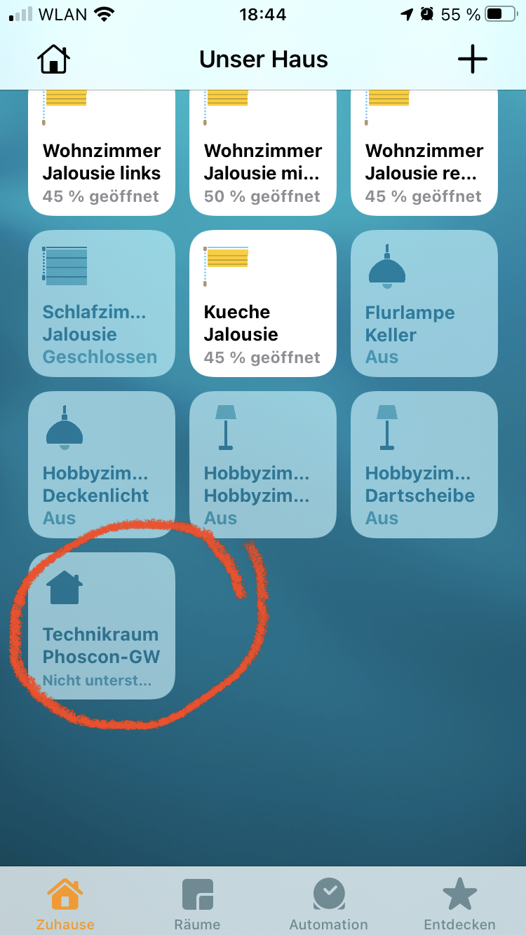 eingetragen habe, konnte ich dann, nach einem Neustart der Homebridge, in HomeKit den Phoscon-GW aus dem Favoriten entfernen.