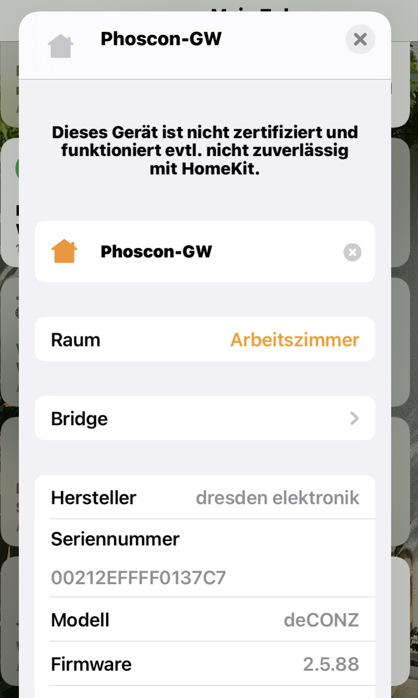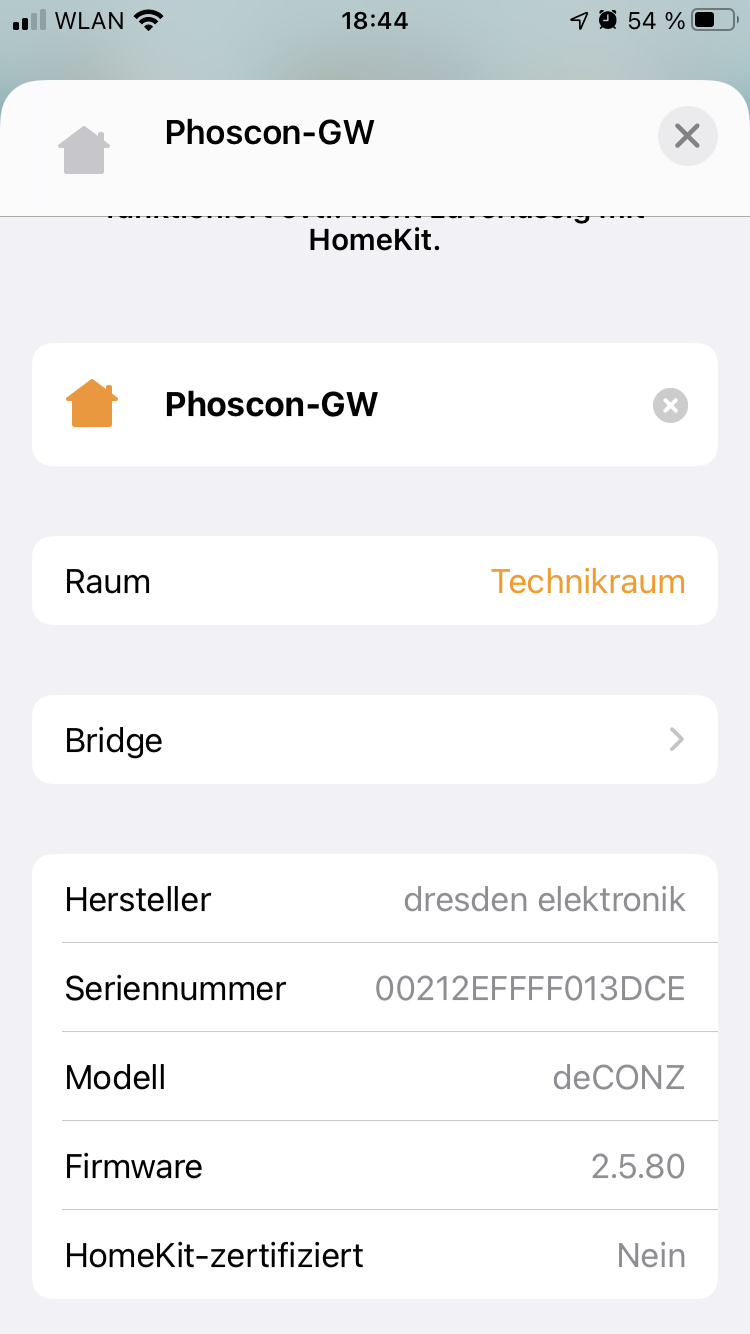 eingetragen habe, konnte ich dann, nach einem Neustart der Homebridge, in HomeKit den Phoscon-GW aus dem Favoriten entfernen.