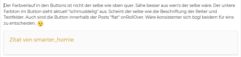 Der Farbverlauf in den Buttons ist nicht der selbe wie oben quer. Sähe besser aus wen's der selbe wäre. Der untere Farbton im Button sieht aktuell "schmuddelig" aus. Scheint der selbe wie die Beschriftung der Reiter und Textfelder. Auch sind die Button innerhalb der Posts "flat" onRollOver. Wäre konsistenter sich bzgl beidem für eins zu entscheiden.