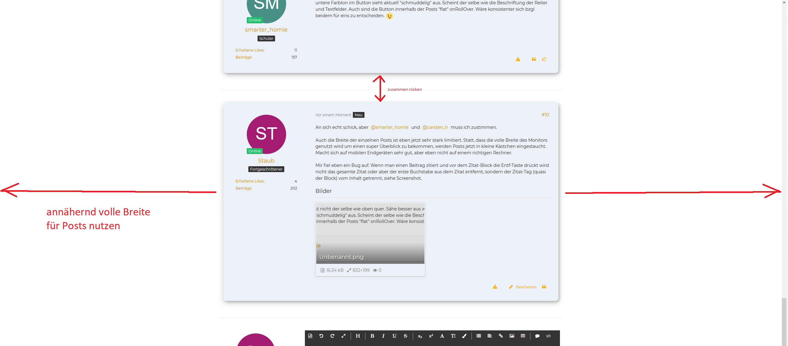 Auch die Breite der einzelnen Posts ist eben jetzt sehr stark limitiert. Statt, dass die volle Breite des Monitors genutzt wird um einen super Überblick zu bekommen, werden Posts jetzt in kleine Kästchen eingestaucht. Macht sich auf mobilen Endgeräten sehr gut, aber eben nicht auf einem richtigen Rechner. Ich glaube es wäre entspannter, wenn es so wäre wie im ersten Screenshot meines Anhangs unten. Das Design und die Farben sind an sich echt gelungen, nur die "Post-Boxen" eben nicht glücklich gelöst, als ob man eben eine mobile Version des Forums auf einem PC aufrufen würde.