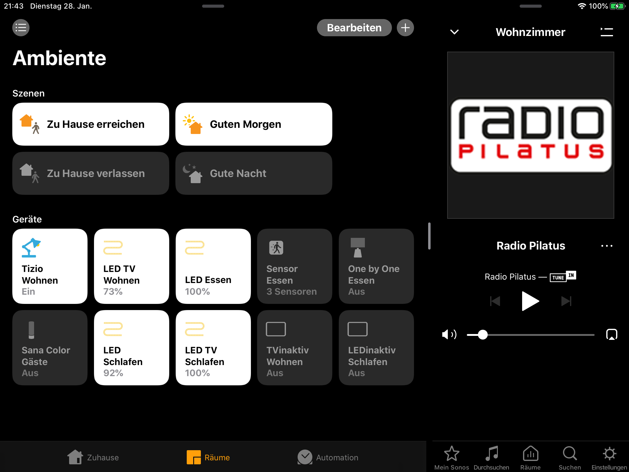 da mich kein Sonos PlugIn (Homebridge) überzeugt hat und die meisten auch nicht unter Apple HomeKit laufen, habe ich auf meinem iPad an der Wand eine pragmatische Lösung eingerichtet. Mit OS 13.x lassen sich mehrere Apps nebeneinander darstellen. 2/3 für AppleHome und 1/3 für Sonos. AppleHome habe ich einen schwarzen Hintergrund verpasst, das sieht dann zusammen mit Sonos wie aus einem Guss aus. Sonos lässt sich trotzdem mit Siri steuern über die "Orto für Sonos" App oder mit dem Plugin https://www.npmjs.com/package/homebridge-sonos lässt sich Sonos z.B. mit der Szene "Guten Morgen" verknüpfen, damit Sonos automatisch startet. Die Bedienung (Sender, Lautstärke etc.) aber über die Sonos App.