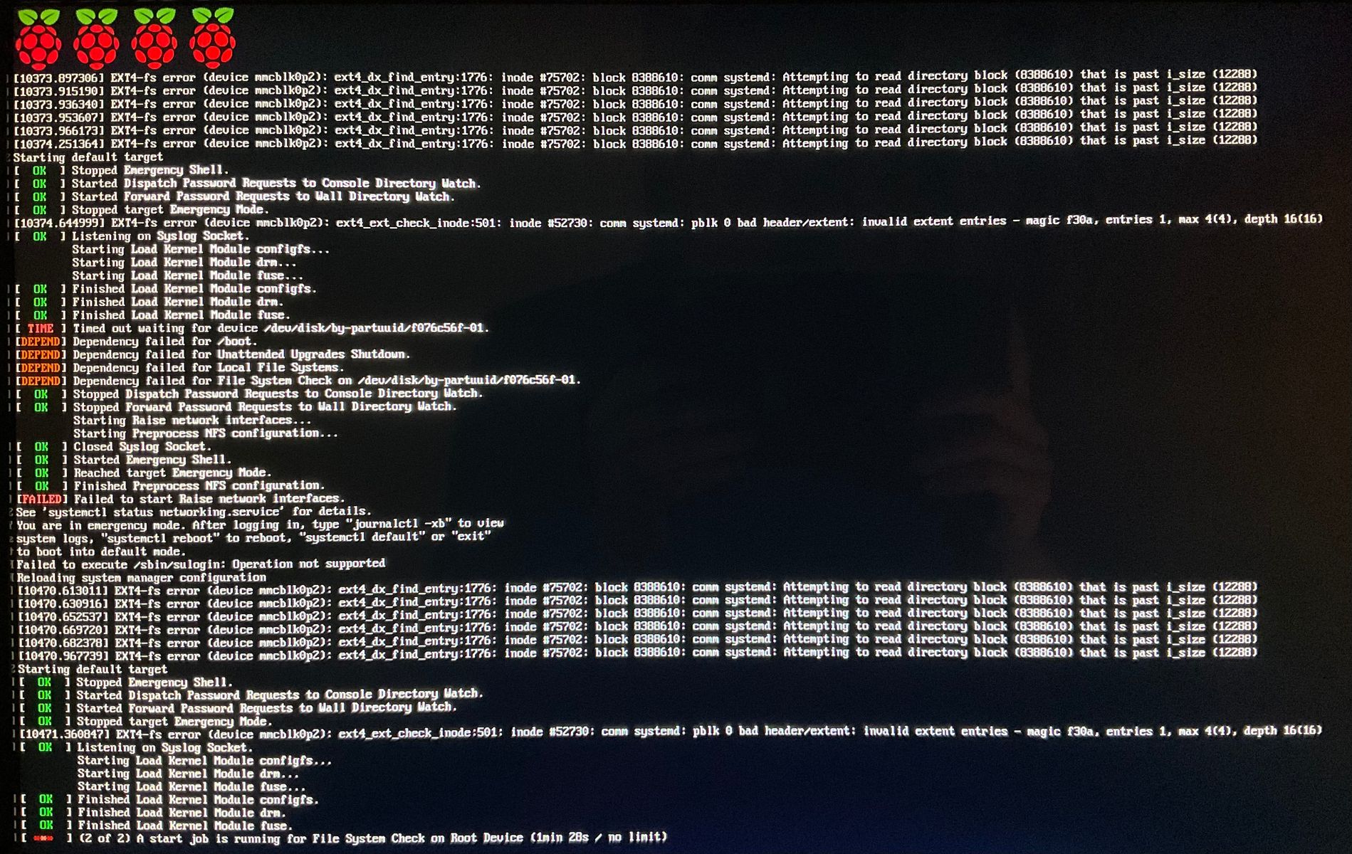 Ich habe vor ein paar Tagen die SD-Karte neu aufgesetzt, d.h. via Raspberry Pi Imager Homebridge aufgespielt, ins Raspi gesteckt und anschließend via SSH FHEM und Phoscon inkl. meiner Backups aufgespielt. Bis heute ging alles wieder einwandfrei, plötzlich war heute Nachmittag weder FHEM noch Homebridge via Browser erreichbar, nur noch Phoscon. Über SSH war der Raspi nicht erreichbar. Da auch alle Homekit Geräte aus Homebridge nicht mehr funktioniert haben, habe ich den Raspi an einen Monitor angeschlossen. Ich sehe nun folgende Informationen, die scheinbar einen Fehler anzeigen. Leider verstehe ich es inhaltlich nicht. Kann mir jemand helfen, diese Meldungen zu deuten?