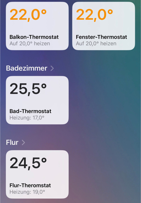 Versuch es doch mit den Eve Room. Dann eine Automation wenn Temperatur unter x Grad dann Heizen und wenn Temperatur über x Grad Heizung aus. So hab ich es bei mir im Flur.