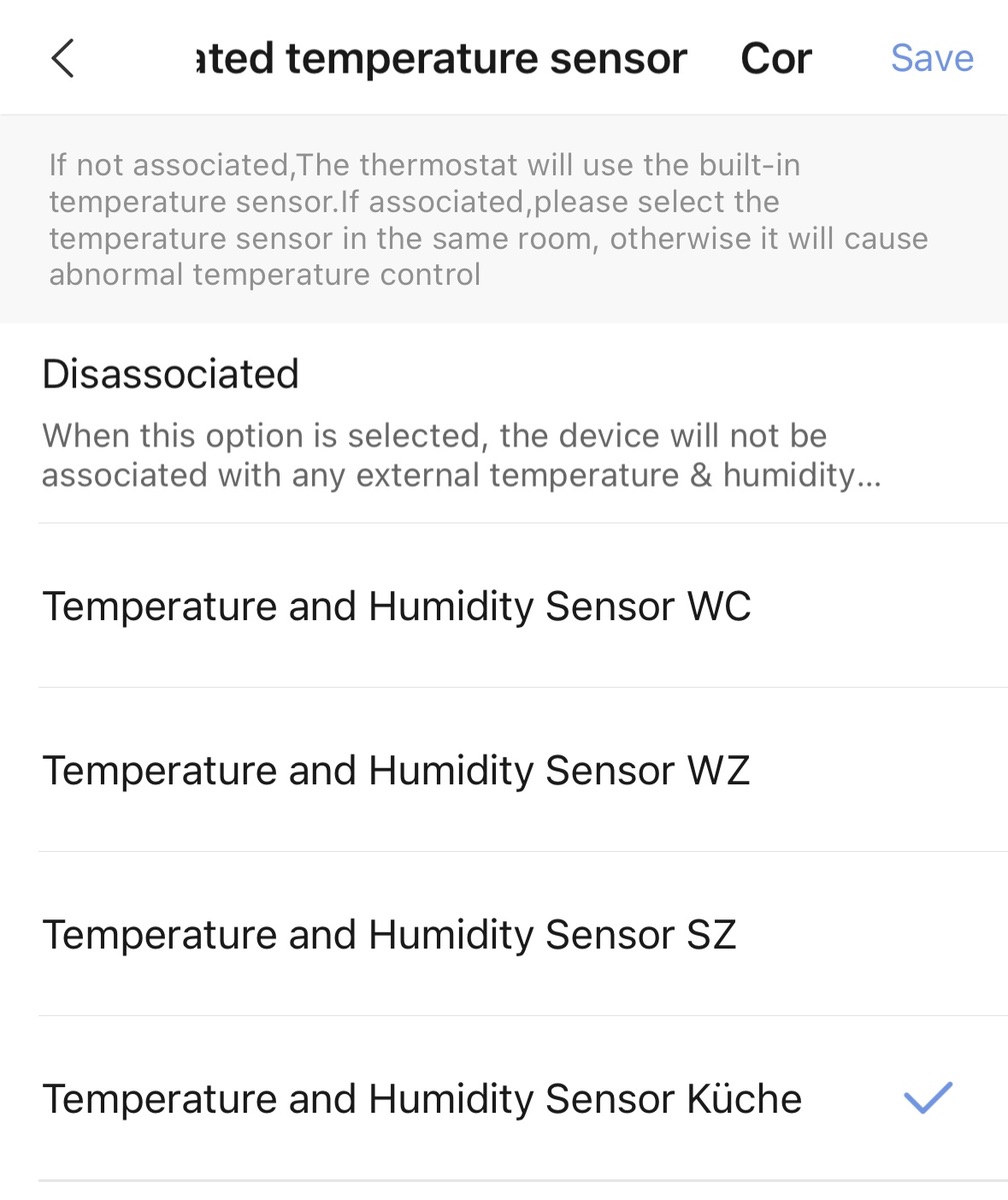 Ich kann die Kopplung ohne Probleme ändern oder ganz löschen. In den Settings des Thermostates unter „More settings“ > „Correlated temperature sensor“