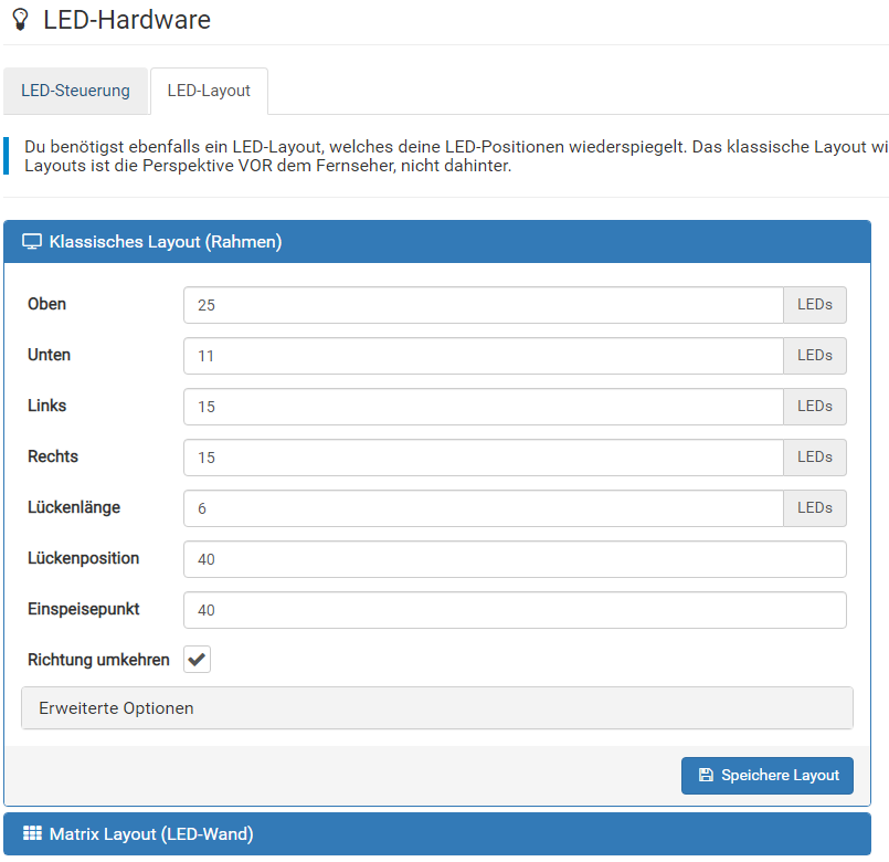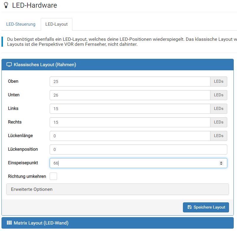 Ich bin gerade leicht überfordert. Habe Hyperion mal so eingestellt wie ich es für richtig halte. Der Einspeisepunkt (1) und die Laufrichtung passen, das Bild von Hyperion würde mit der Beleuchtung auch passen, allerdings ist in Wirklichkeit die LED´s versetzt zum Bild. Das rot ist in Wirklichkeit eher oben und rechts, als links.