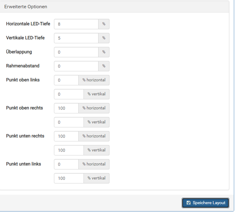Komm bislang noch nicht mit den Einstellungen (Lichter oben unten rechts und links, Lücken Überschneidung, Bildverhältnis) noch nicht ganz klar.