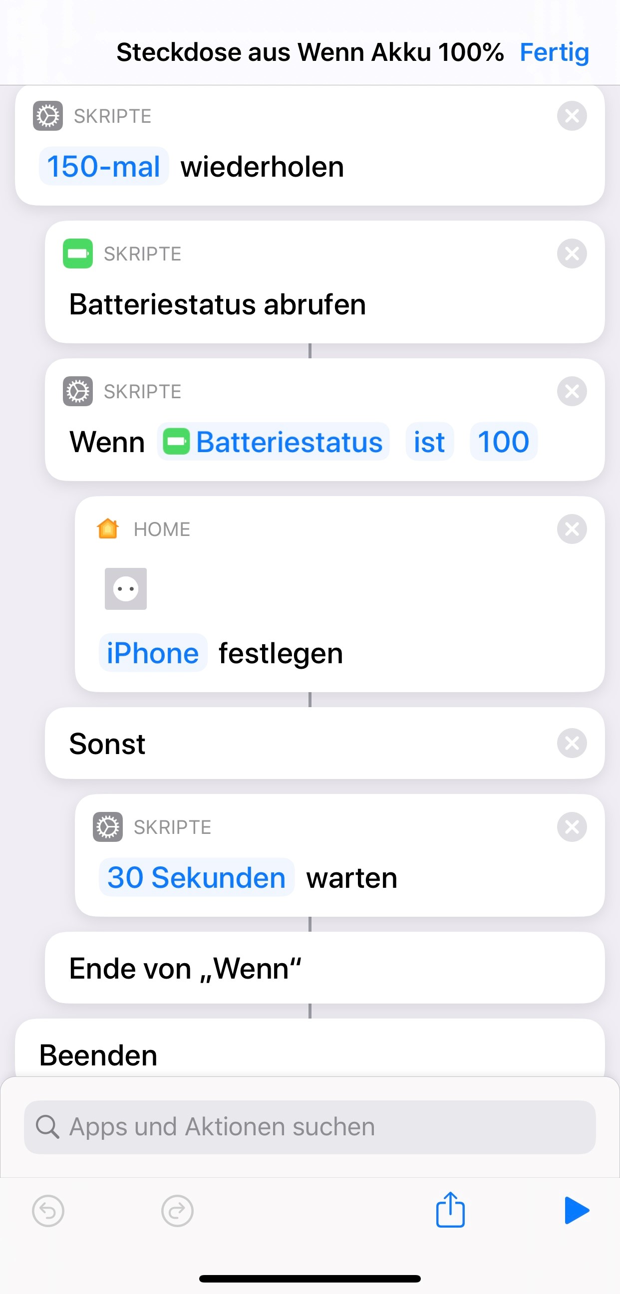 ich bin auf der suche nach einen Kurzbefehl der mir die Steckdose abschaltet sobald das iPhone vollgeladen (100%) ist.