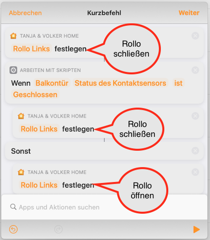 Wenn ich den Befehl von Hand in Automation/Kurzbefehle anstupse, funktioniert es, doch wenn man über die Schaltfläche in HomeKit das Rollo runter fährt, fährt es trotz offener Tür runter, wo ist der Fehler ???