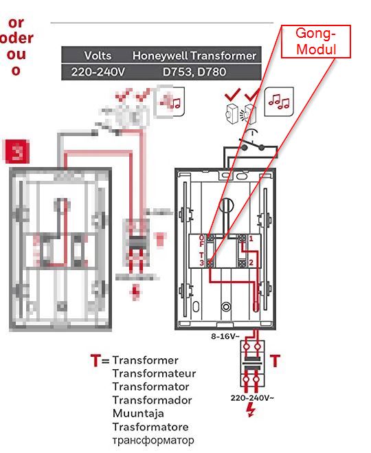 Jetzt wollte ich die Türklingel anschließen. Dazu habe ich die beiden Kabel des Gong-Moduls mit 0F und T3 verbunden. Die Klingel leuchtet dann wie beschrieben und im Anschluss läutet der Gong dann auch, wenn ich den Taster drücke. Aber der Gong brummt die ganze Zeit..