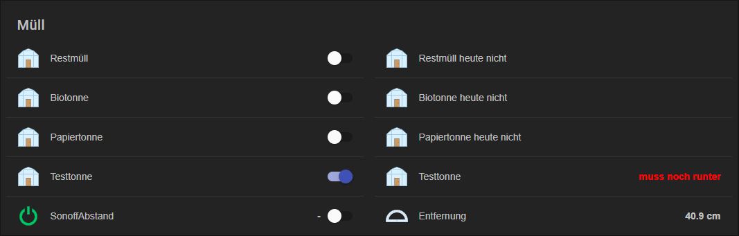 Einen einfachen Müllabfuhr-Kalender als Sensor in Homekit habe ich ja schon länger in Betrieb. Soweit auch so gut, am Vortag der Abholung fängt das Ding an zu hupen, dass morgen Rest, Bio oder Papier abgeholt wird. Da dann allerdings noch nicht klar ist, ob schon die Frau die Tonne runter hat oder ich nach der Schicht diese noch runterstellen muss wollte ich das Ganze noch erweitern und einen Smart-Müll-Sensor basteln.