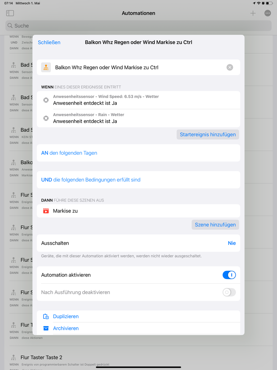 Solltet ihr unsere Automation Rollos automatisch mit dem Wecker öffnen im Einsatz haben, könnt ihr dort vor dem Öffnen der Rollos auch einfach die Wetterbedingungen prüfen und gegebenenfalls die Rollos geschlossen lassen.
