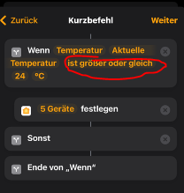 Hab die Automation in Kurzbefehle konvertiert und dann mit Wenn die Temperatur von meiner Netatmo Station am Balkon abgefragt.