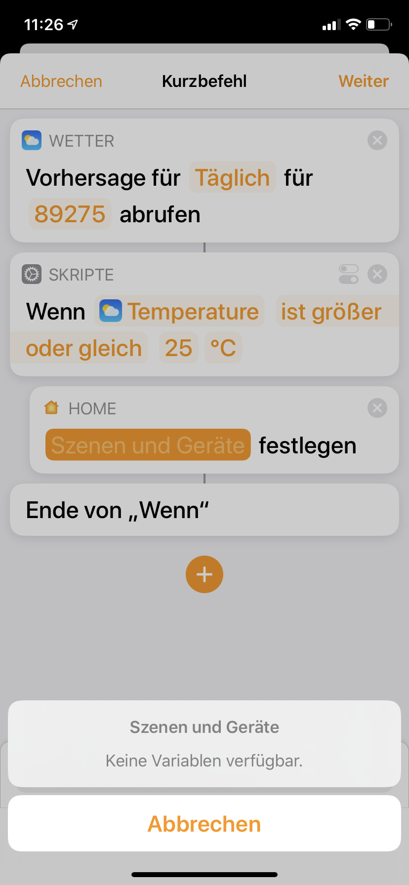 • yannic Vielen Dank für die super Schritt-für-Schritt-Anleitung. Das ist mein erster Kurzbefehl und ich bin fast am Ziel. Nur das Festlegen der Szenen und Geräte im letzten Schritt will bei mir nicht gelingen. Ein kurzer Tip bringt nichts, bei einem langen Tip wird mir angezeigt "Szenen und Geräte. Keine Variablen verfügbar.". Mache ich irgendwas falsch oder fehlt mir irgendeine Einstellung?