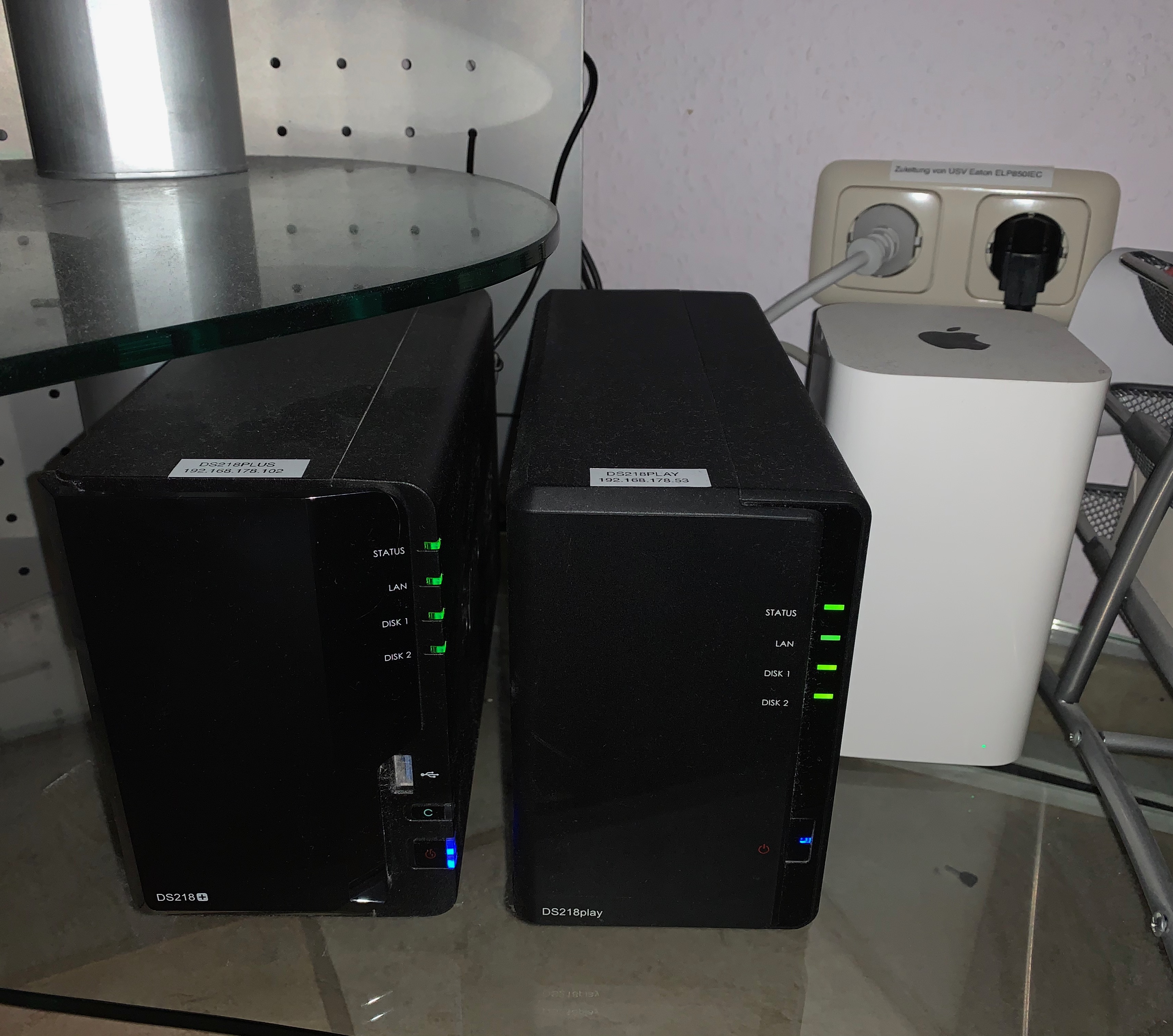 links steht meine DS218+ auf der HB auf einem Docker lĂ€uft, rechts daneben eine DS218play, die dient als Backup fĂŒr die 218+, wiederum daneben steht die Time Capsule fĂŒr das Backup der TimeMaschine des MacBook Pro meiner Frau und meines iMac