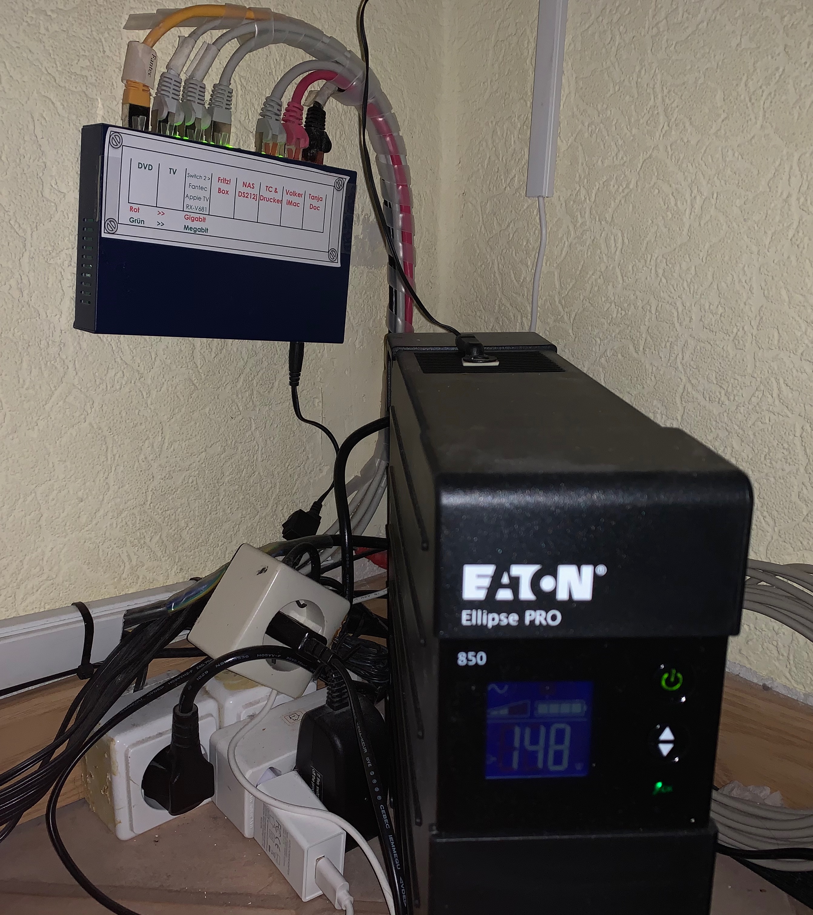 Hier sieht man einen 8er Gigabitverteiler fĂŒr all unsere NetzwerkgerĂ€te, im Vordergrund die Eaton USV, normal sieht man sie nicht, habe sie nur etwas zur Seite gerĂŒckt